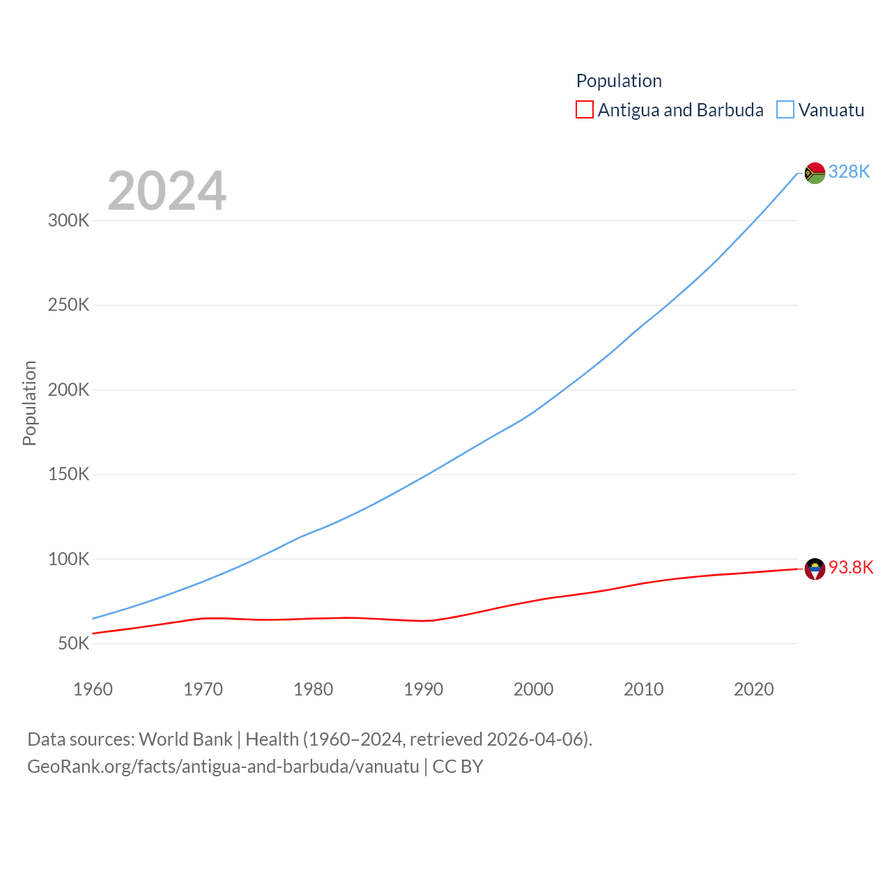 Antigua and Barbuda has a population of 93.8K (ranked 185/197), compared with 328K in Vanuatu (ranked 174/197). Antigua and Barbuda's land area is 169.9 sq mi versus 4,707 sq mi for Vanuatu (ranked 183rd vs. 157th).