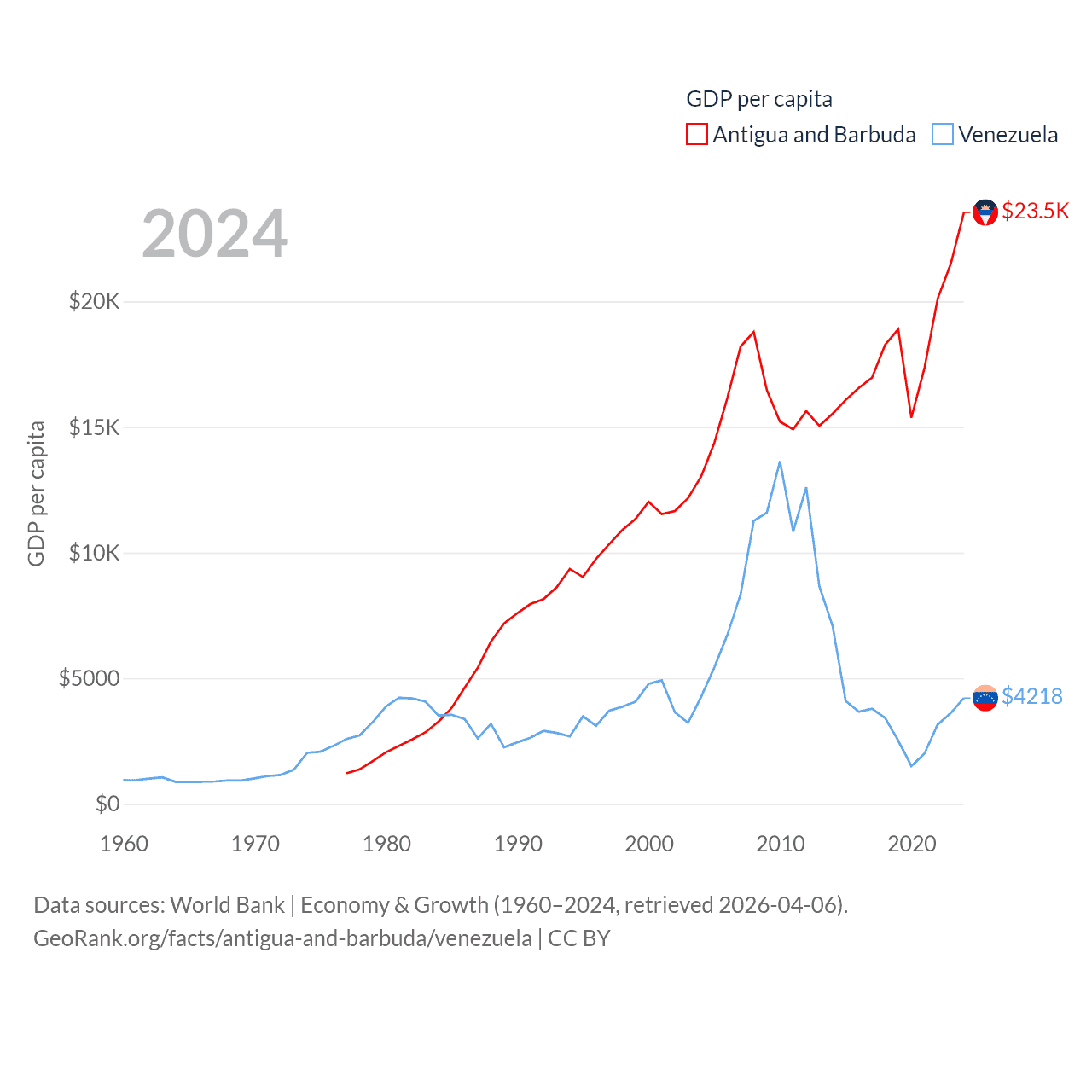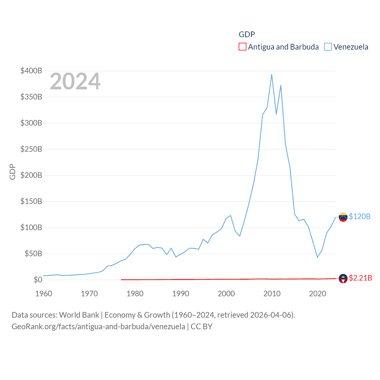 By GDP, Antigua and Barbuda ranks 177/197 ($2.21B) and Venezuela ranks 65/197 ($120B). By GDP per capita, Antigua and Barbuda ranks 53/197 ($23,542), while Venezuela ranks 128/197 ($4,218).
