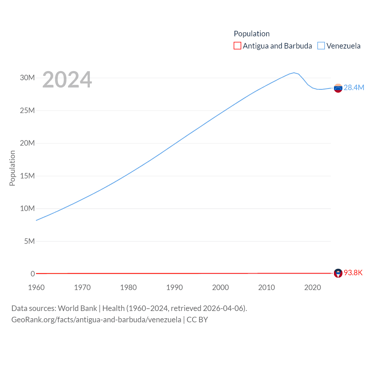 Antigua and Barbuda has a population of 93.8K (ranked 185/197), compared with 28.4M in Venezuela (ranked 53/197). Antigua and Barbuda's land area is 169.9 sq mi versus 340,561 sq mi for Venezuela (ranked 183rd vs. 32nd).
