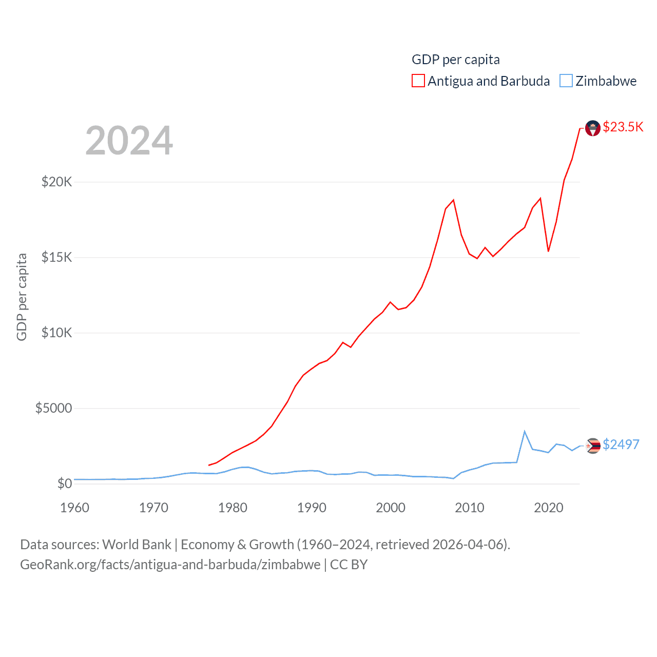 By GDP, Antigua and Barbuda ranks 177/197 ($2.21B) and Zimbabwe ranks 102/197 ($41.5B). By GDP per capita, Antigua and Barbuda ranks 53/197 ($23,542), while Zimbabwe ranks 148/197 ($2,497).