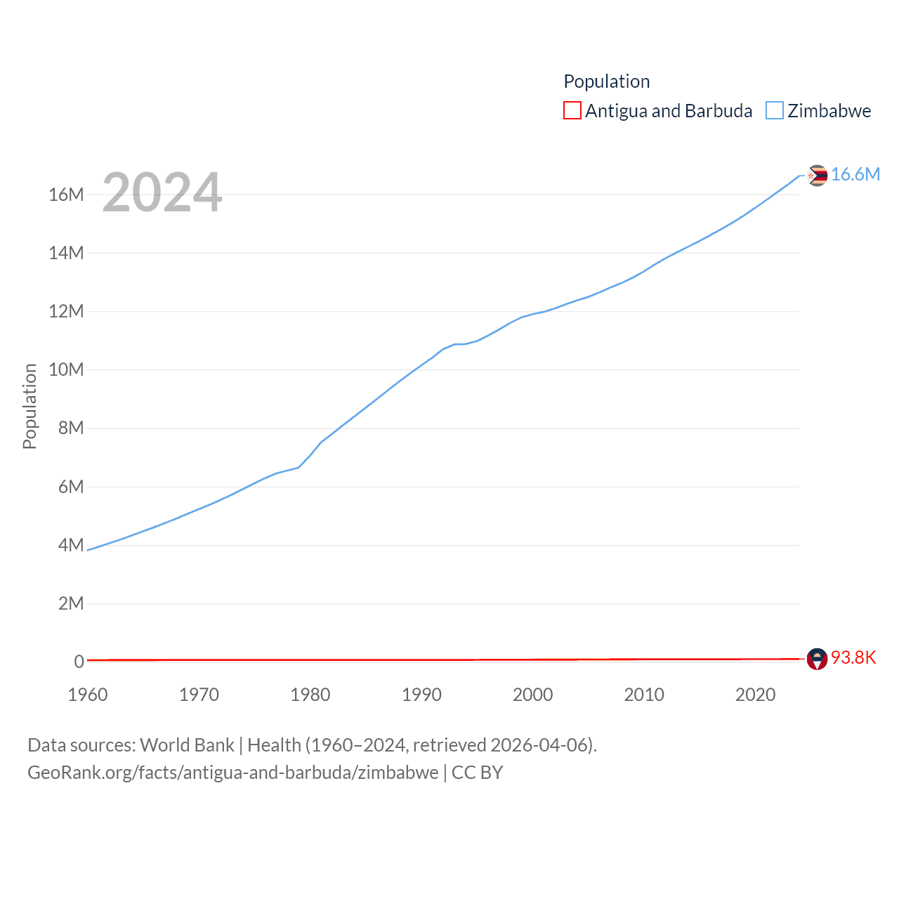 Antigua and Barbuda has a population of 93.8K (ranked 185/197), compared with 16.6M in Zimbabwe (ranked 74/197). Antigua and Barbuda's land area is 169.9 sq mi versus 149,364 sq mi for Zimbabwe (ranked 183rd vs. 60th).