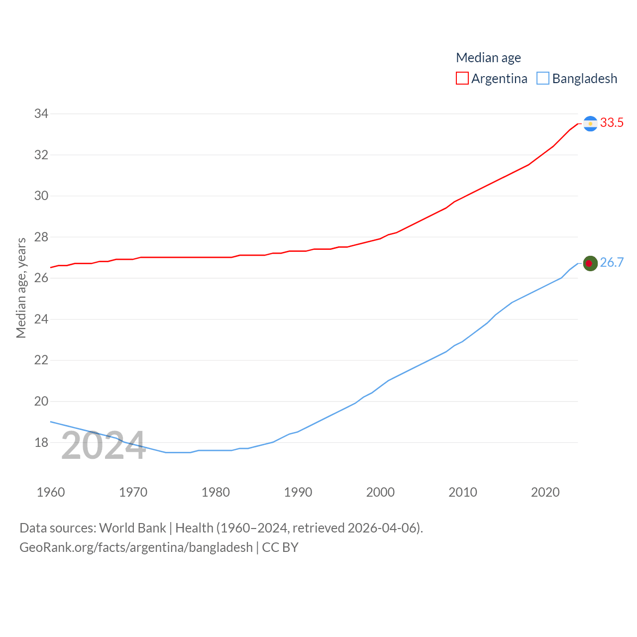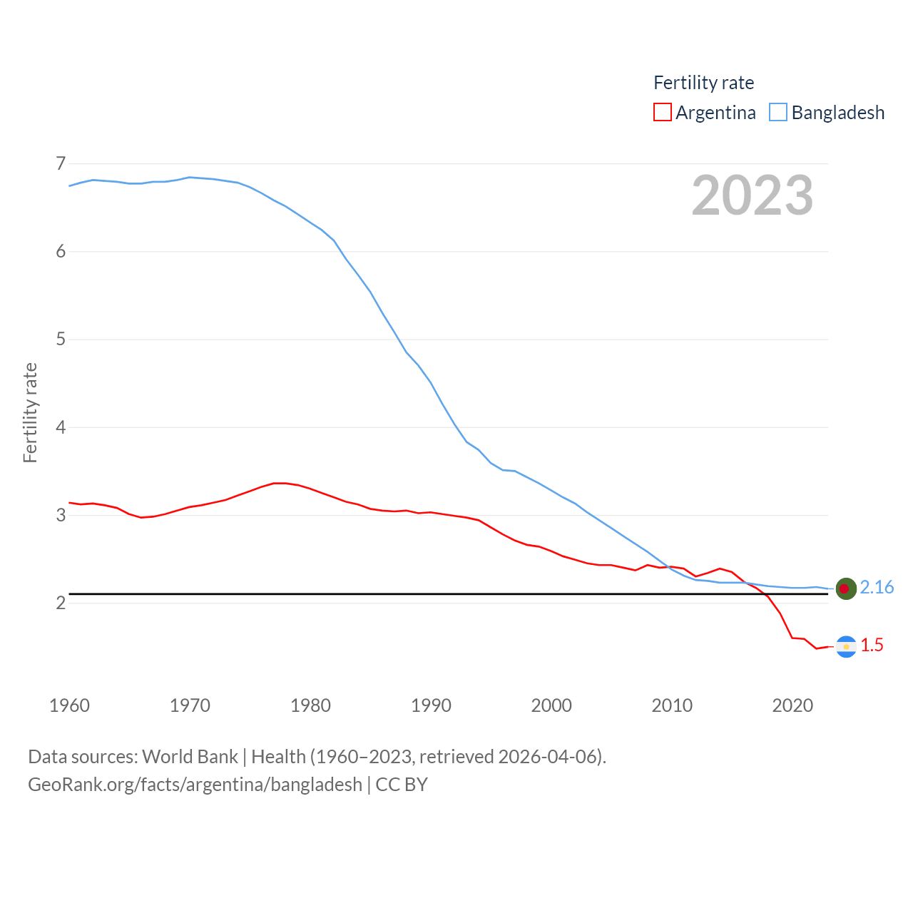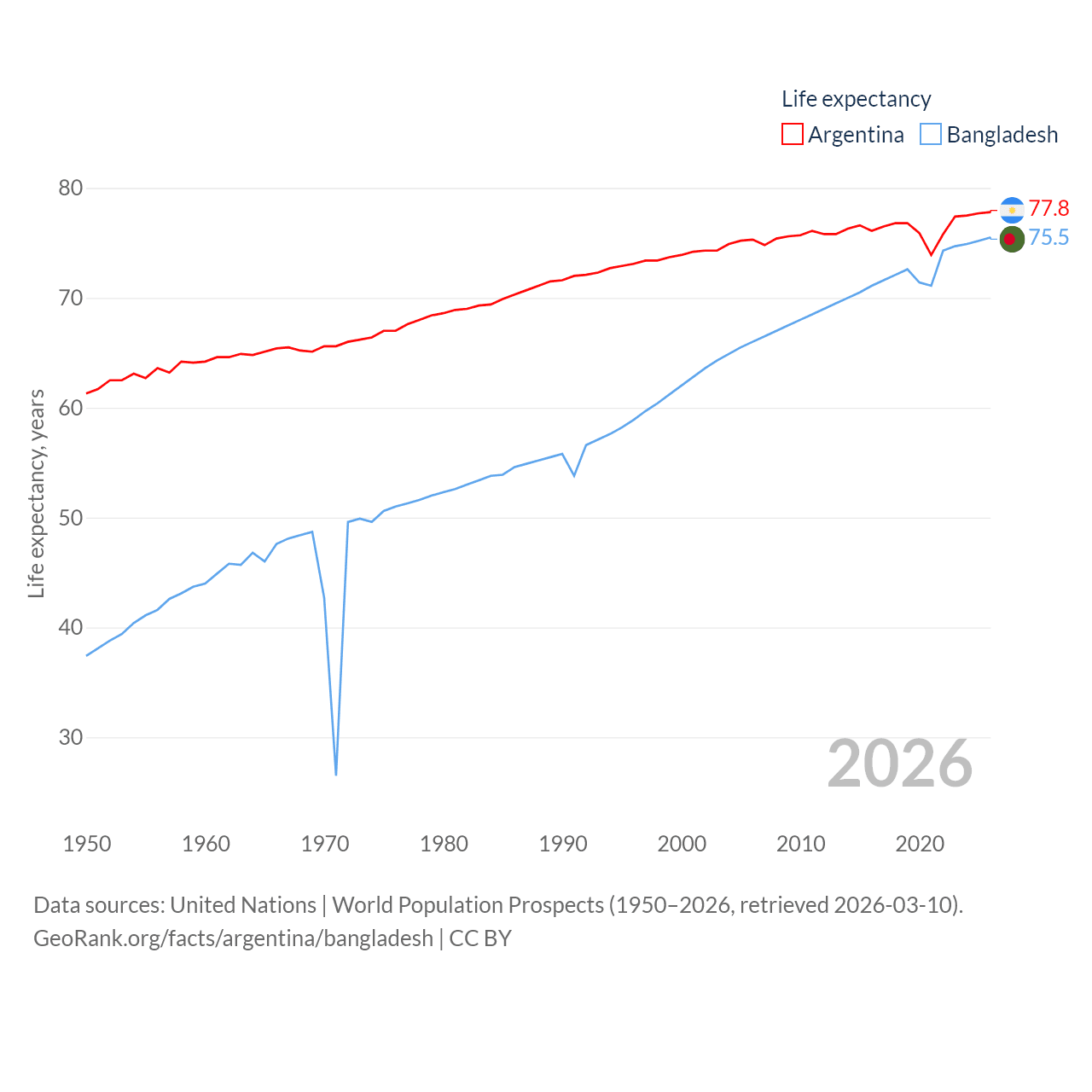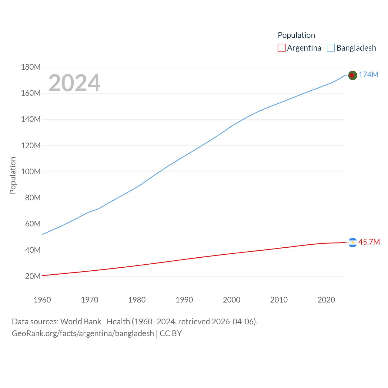 Argentina has a population of 45.7M (ranked 35/197), compared with 174M in Bangladesh (ranked 8/197). Argentina's land area is 1,056,642 sq mi versus 50,186 sq mi for Bangladesh (ranked 8th vs. 94th).