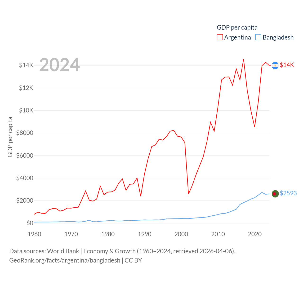 By GDP, Argentina ranks 24/197 ($638B) and Bangladesh ranks 36/197 ($450B). By GDP per capita, Argentina ranks 72/197 ($13,970), while Bangladesh ranks 146/197 ($2,593).