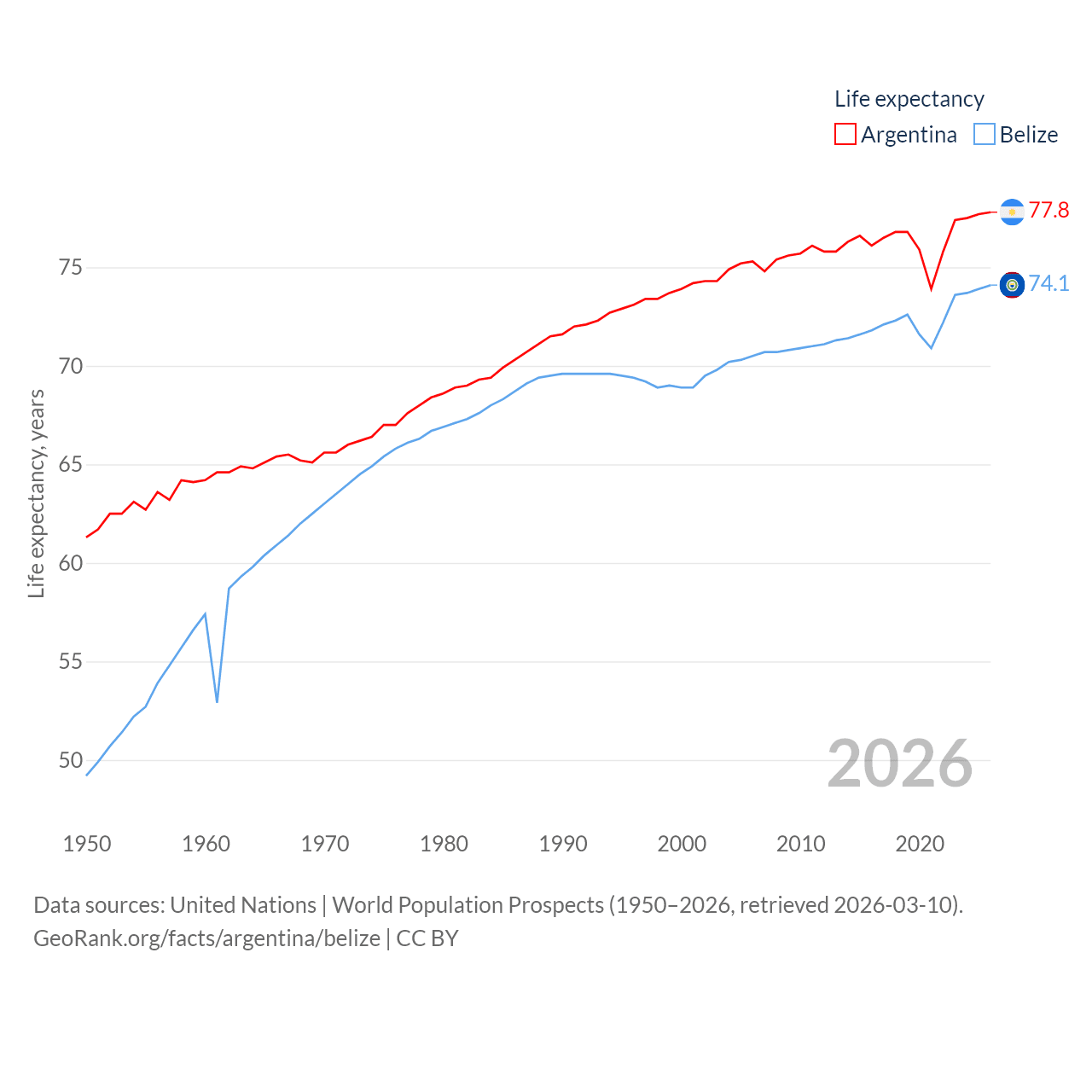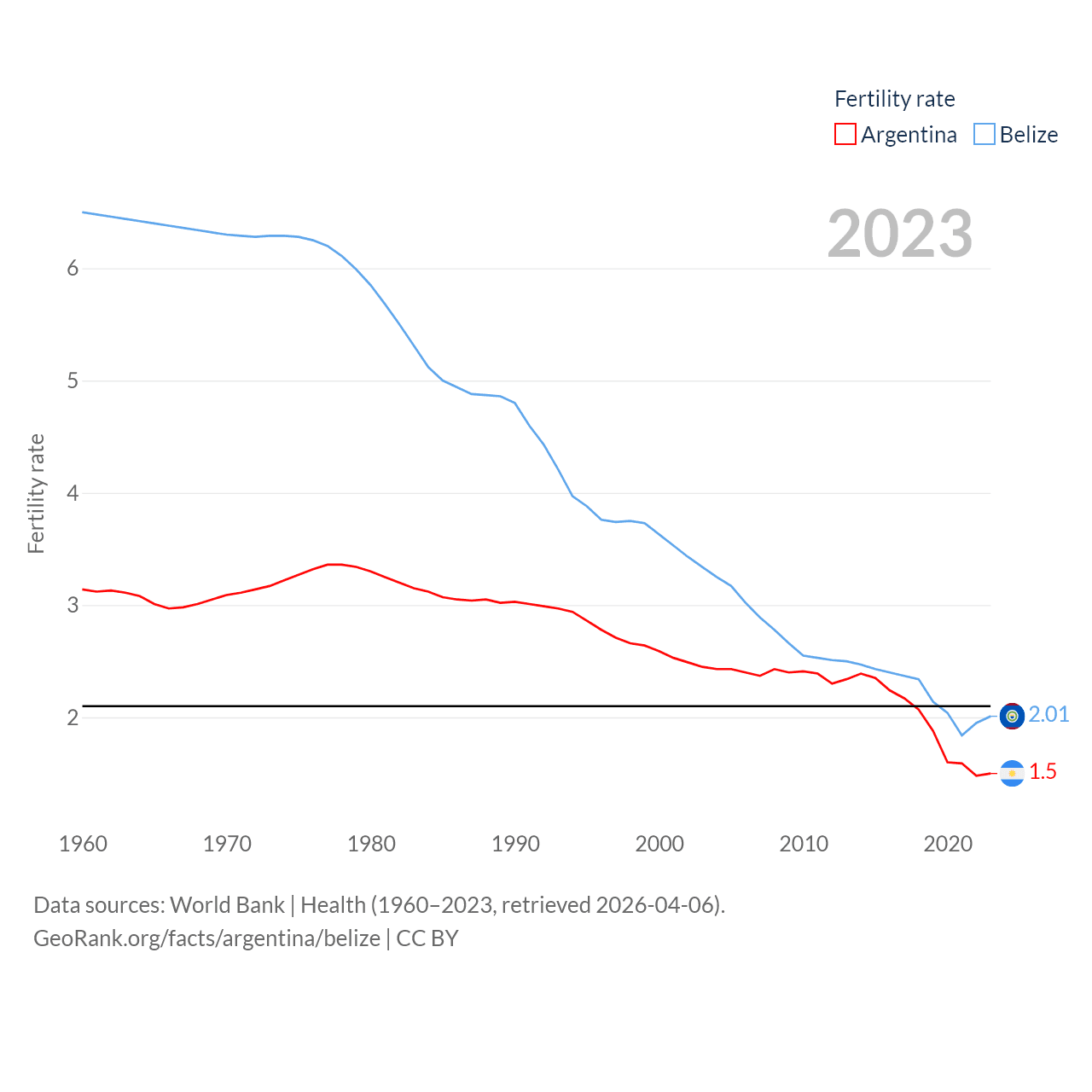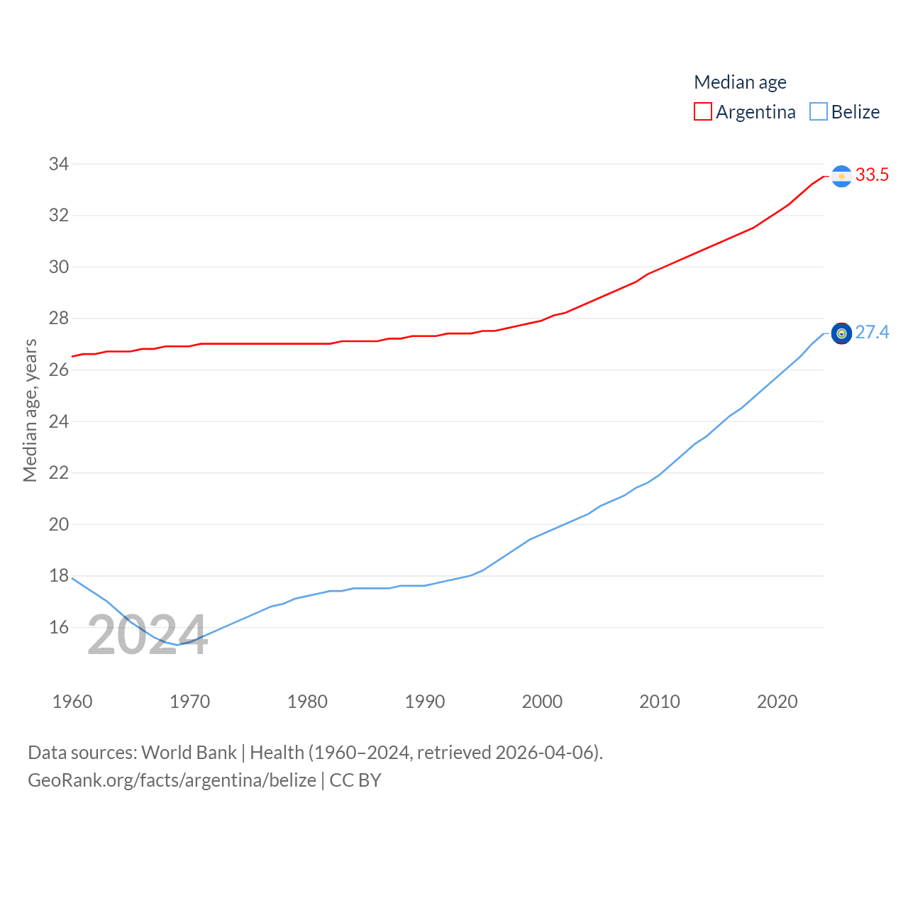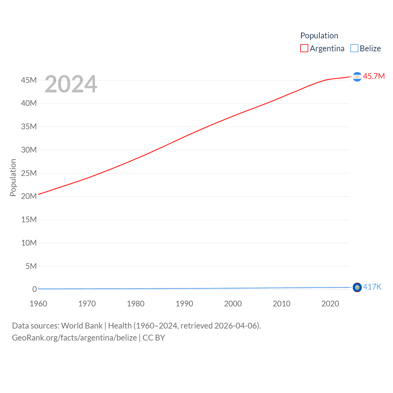 Argentina has a population of 45.7M (ranked 35/197), compared with 417K in Belize (ranked 171/197). Argentina's land area is 1,056,642 sq mi versus 8,807 sq mi for Belize (ranked 8th vs. 148th).