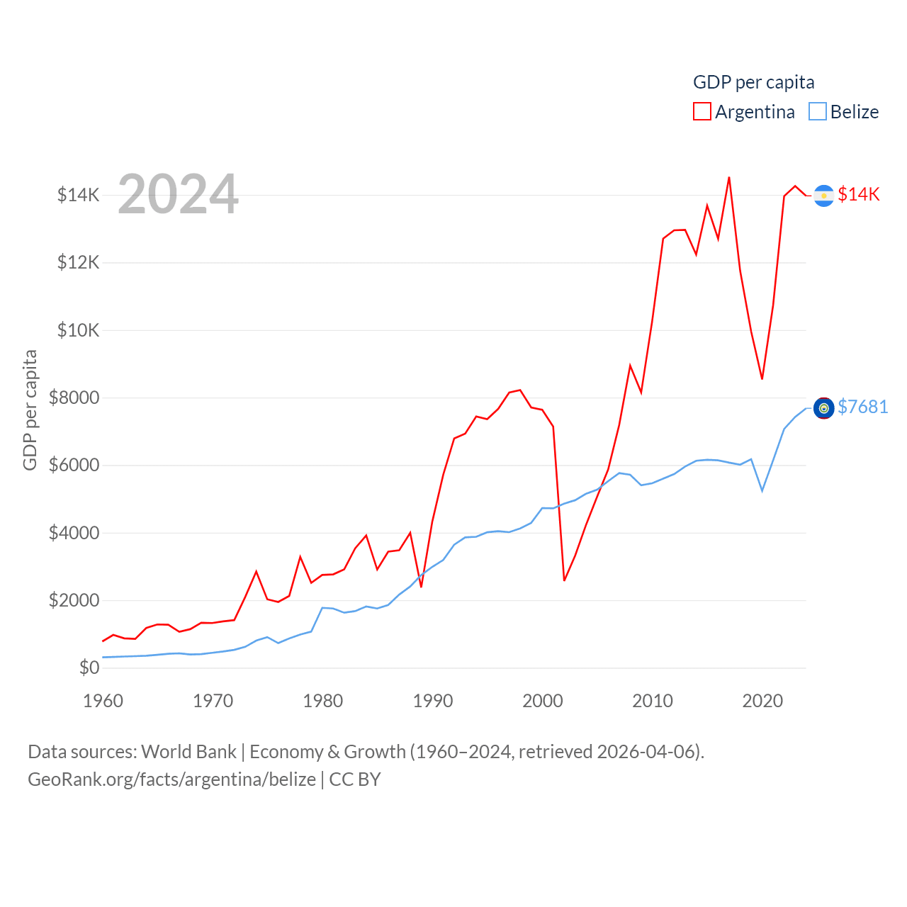 By GDP, Argentina ranks 24/197 ($638B) and Belize ranks 168/197 ($3.2B). By GDP per capita, Argentina ranks 72/197 ($13,970), while Belize ranks 98/197 ($7,681).