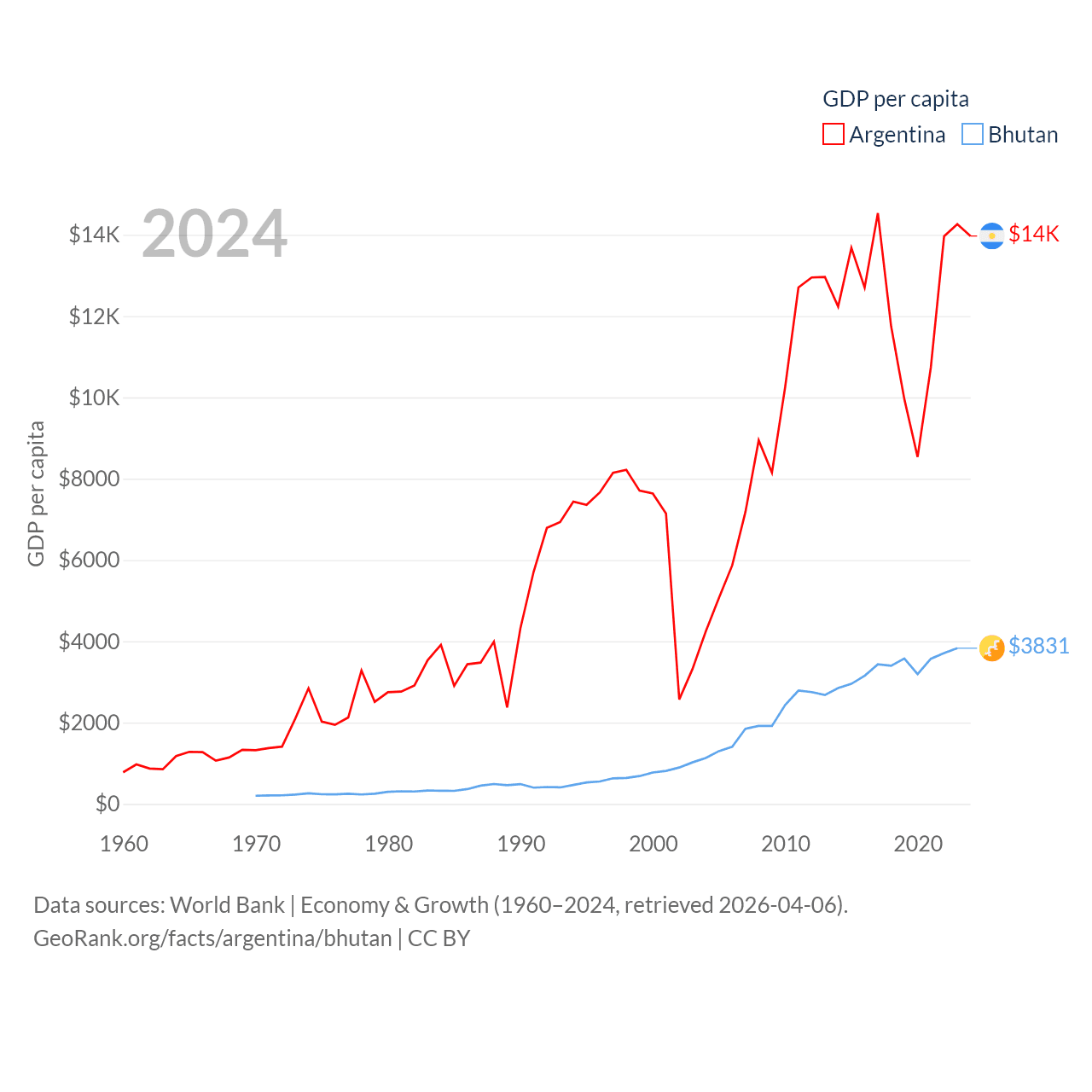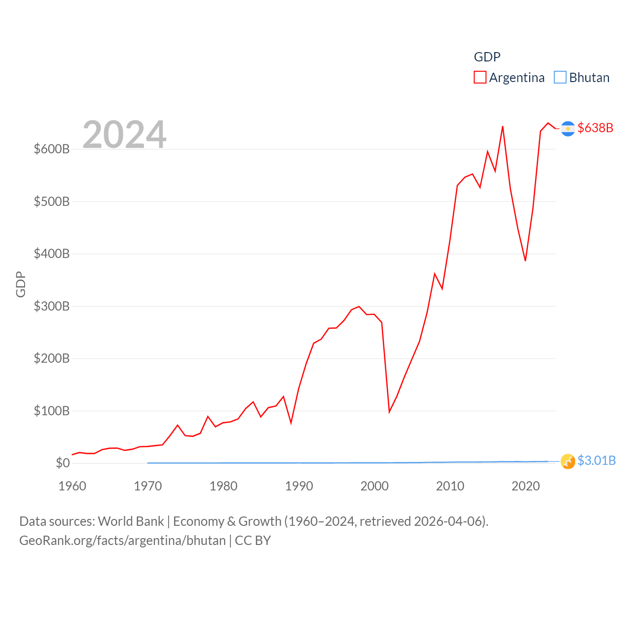 By GDP, Argentina ranks 24/197 ($638B) and Bhutan ranks 170/197 ($3.01B). By GDP per capita, Argentina ranks 72/197 ($13,970), while Bhutan ranks 132/197 ($3,831).