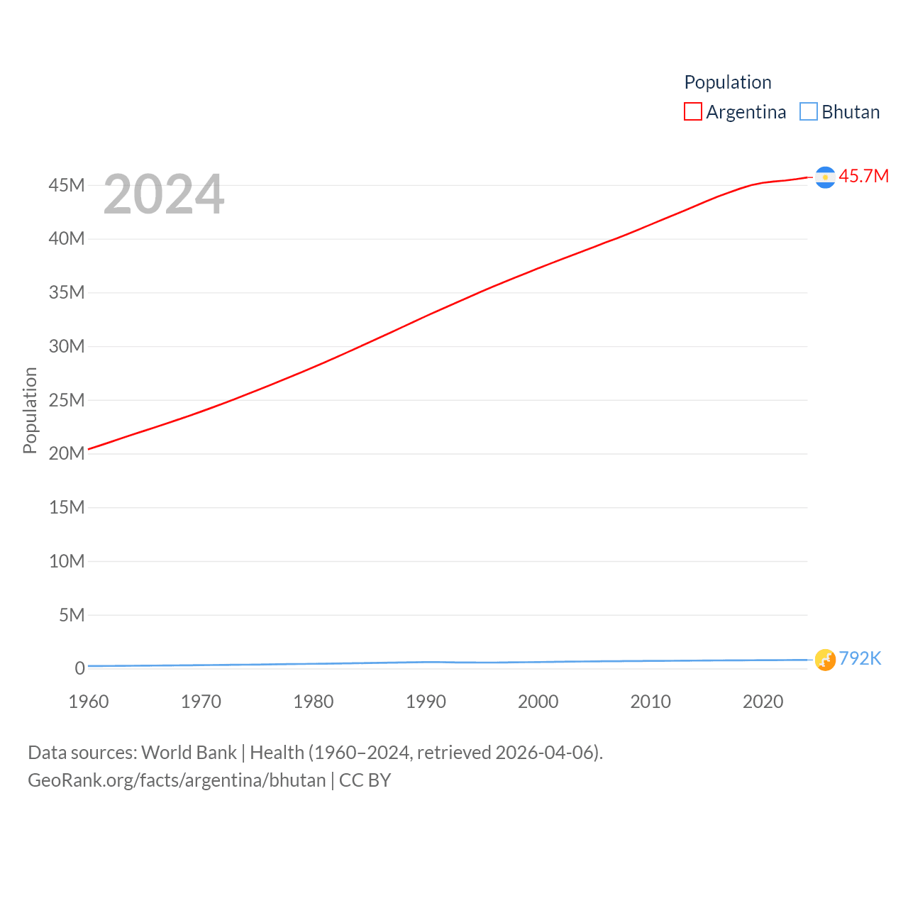 Argentina has a population of 45.7M (ranked 35/197), compared with 792K in Bhutan (ranked 163/197). Argentina's land area is 1,056,642 sq mi versus 14,726 sq mi for Bhutan (ranked 8th vs. 132nd).