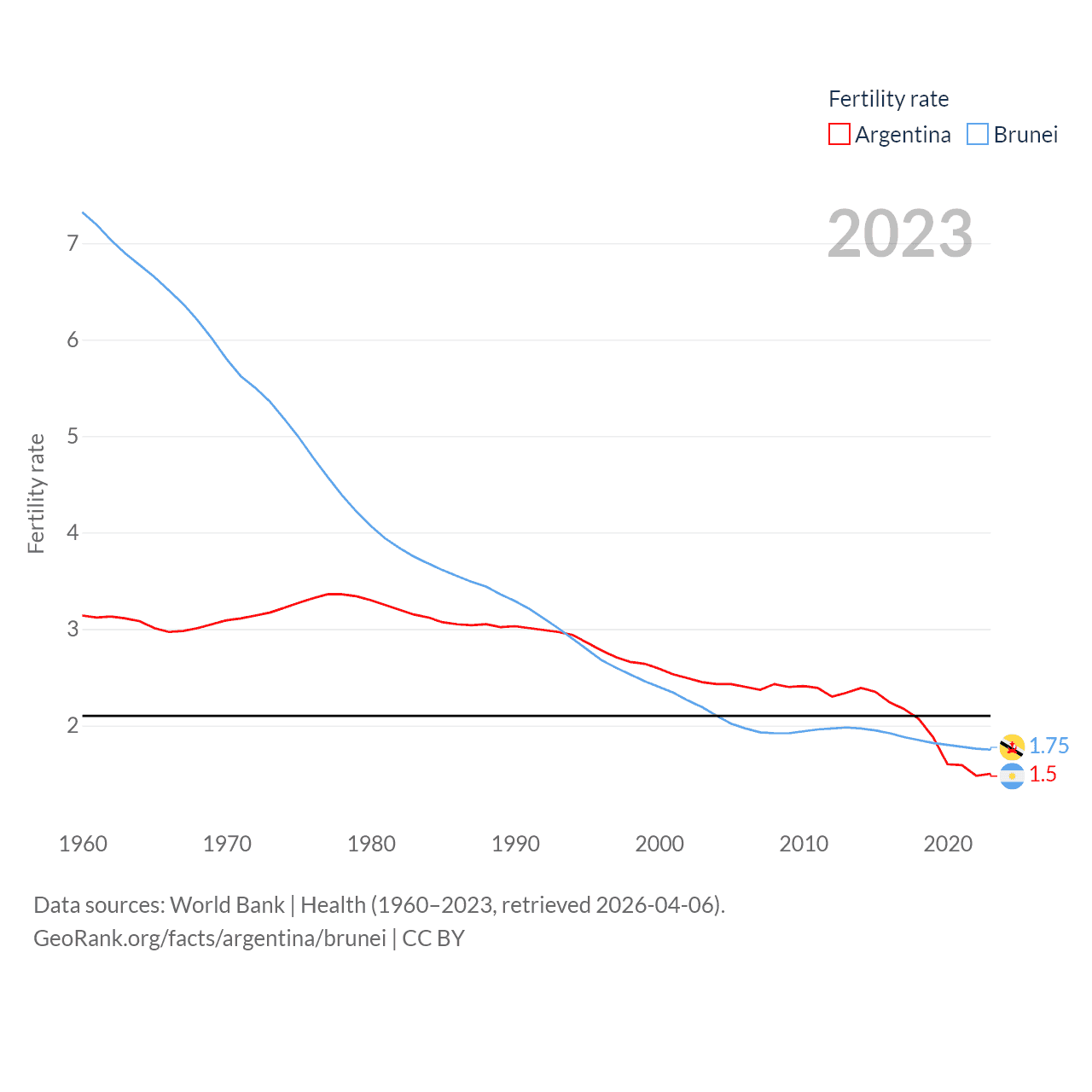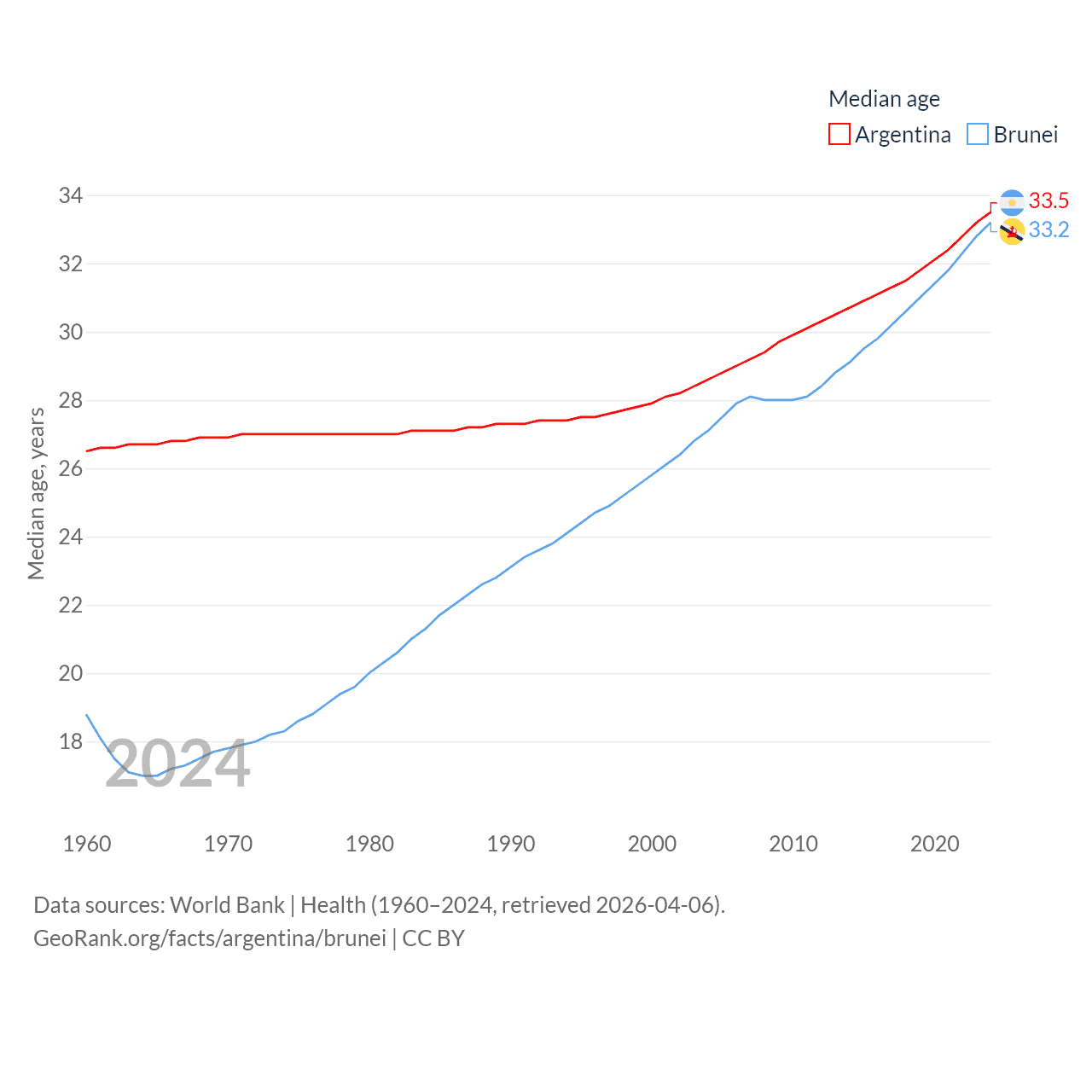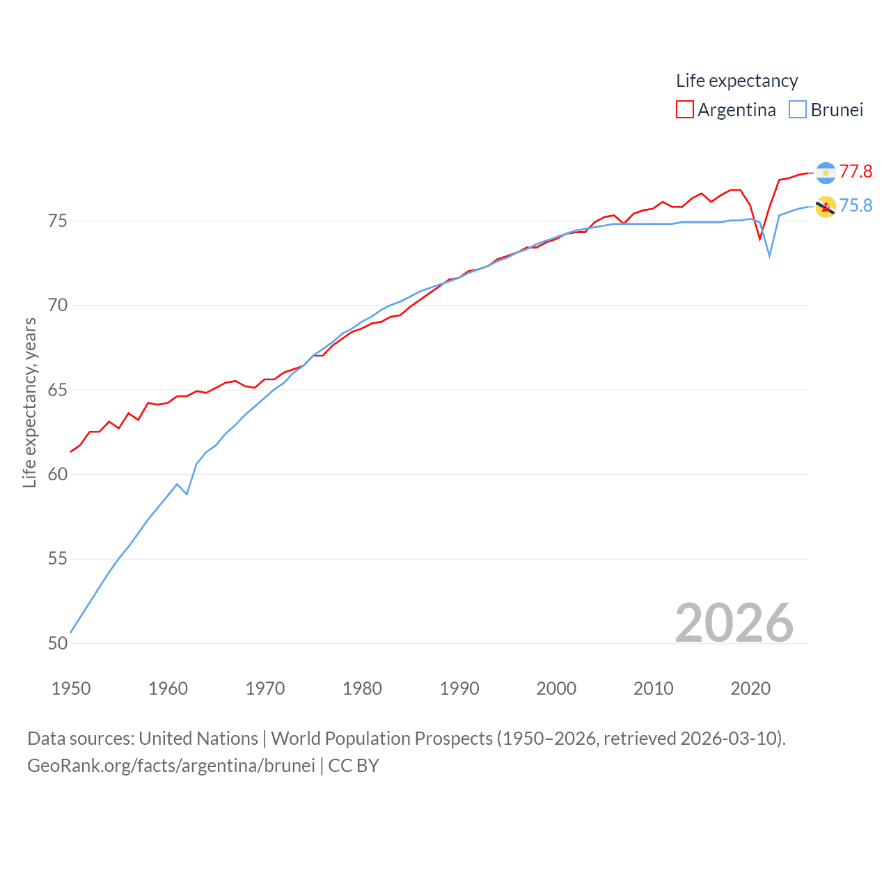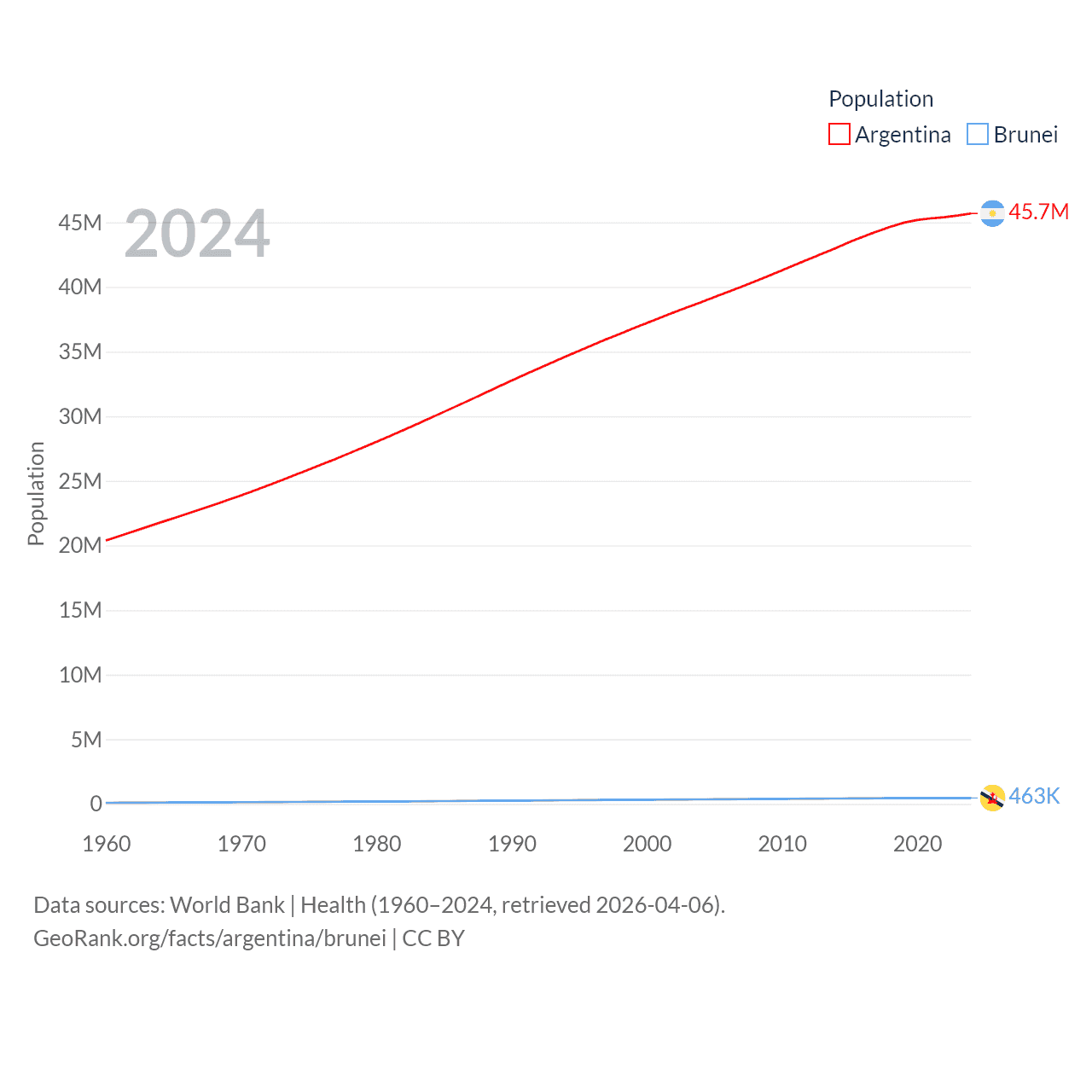 Argentina has a population of 45.7M (ranked 35/197), compared with 463K in Brunei (ranked 170/197). Argentina's land area is 1,056,642 sq mi versus 2,035 sq mi for Brunei (ranked 8th vs. 165th).