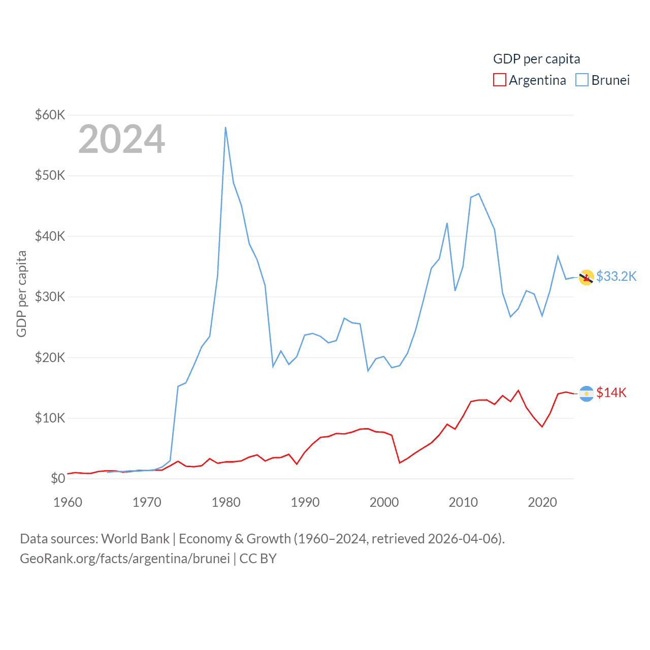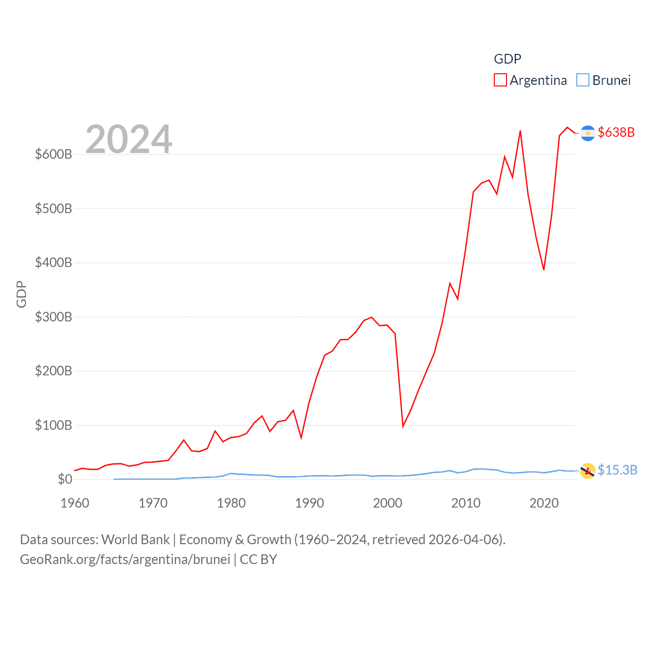 By GDP, Argentina ranks 24/197 ($638B) and Brunei ranks 142/197 ($15.3B). By GDP per capita, Argentina ranks 72/197 ($13,970), while Brunei ranks 36/197 ($33,153).