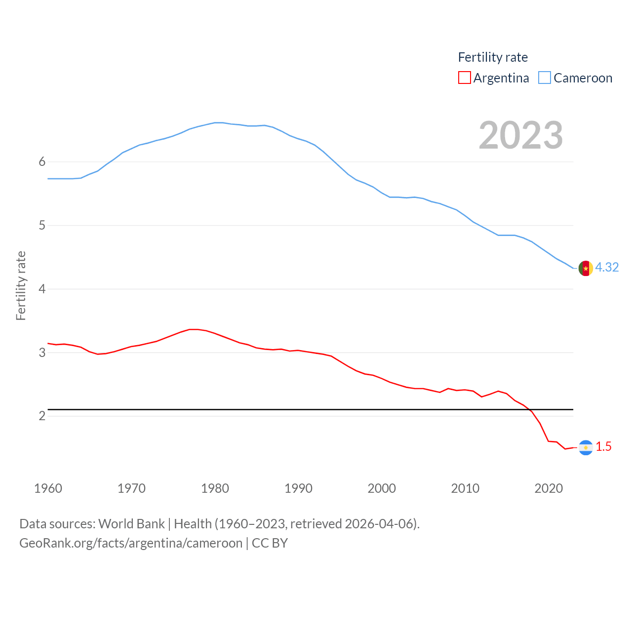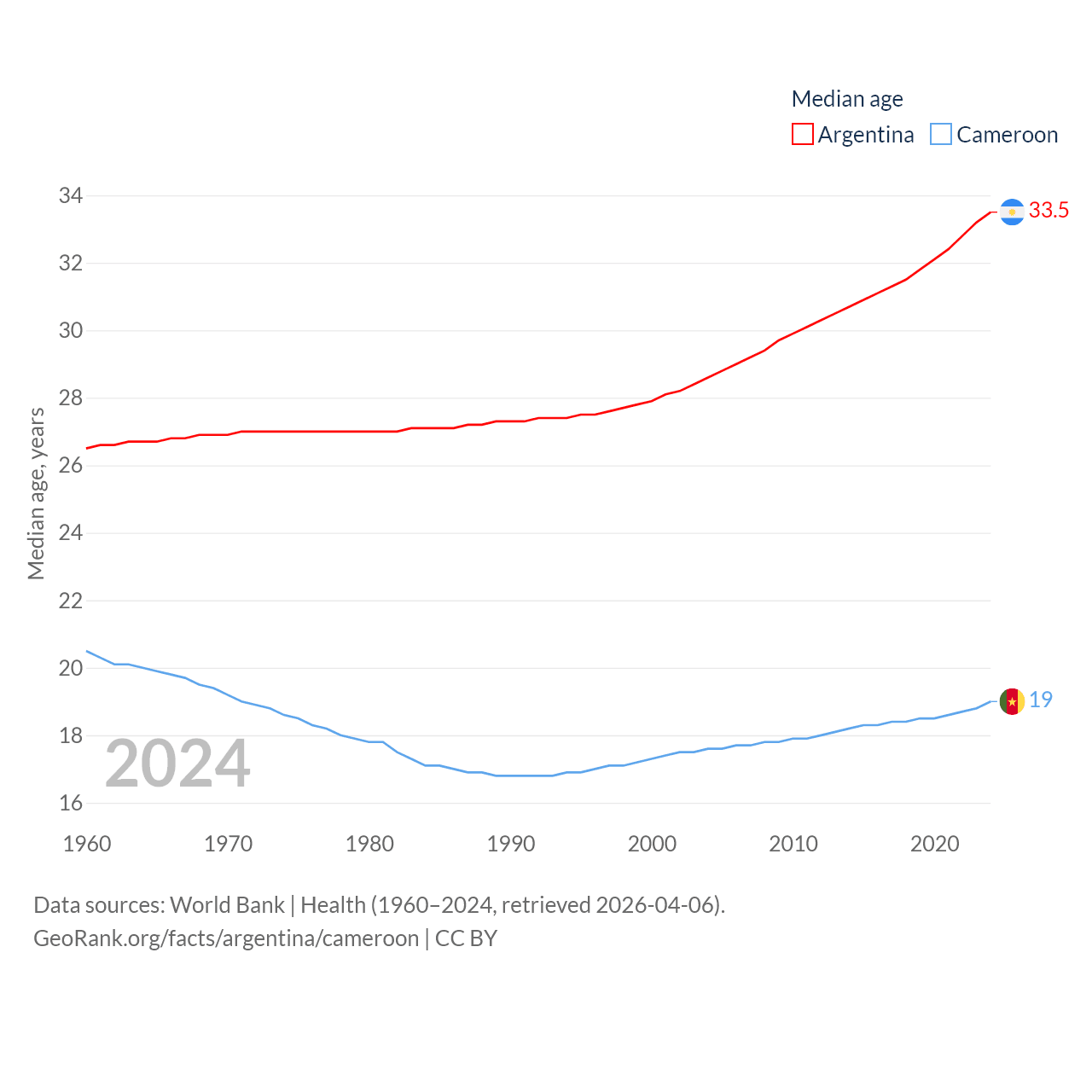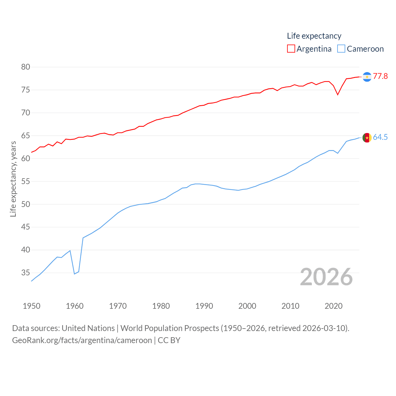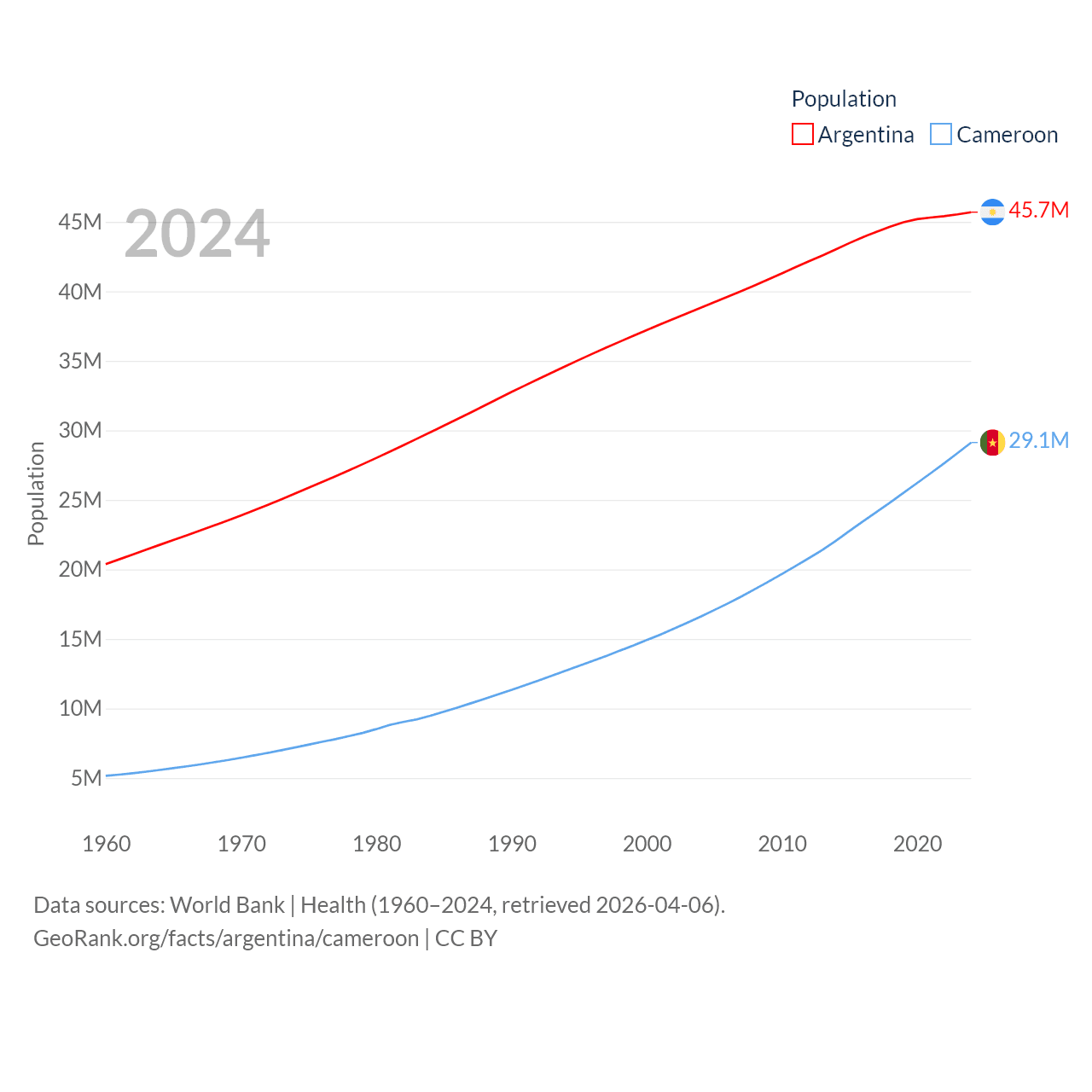 Argentina has a population of 45.7M (ranked 35/197), compared with 29.1M in Cameroon (ranked 52/197). Argentina's land area is 1,056,642 sq mi versus 182,514 sq mi for Cameroon (ranked 8th vs. 52nd).