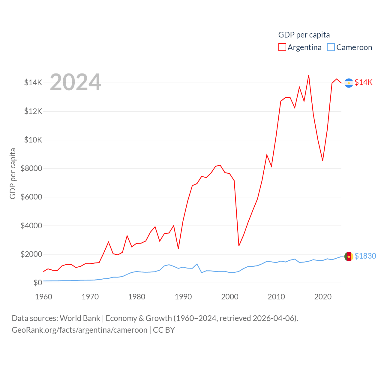 By GDP, Argentina ranks 24/197 ($638B) and Cameroon ranks 91/197 ($53.3B). By GDP per capita, Argentina ranks 72/197 ($13,970), while Cameroon ranks 158/197 ($1,830).