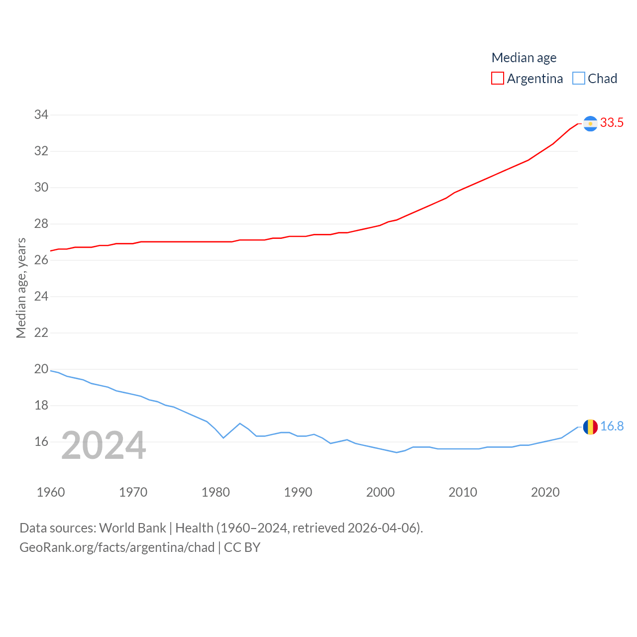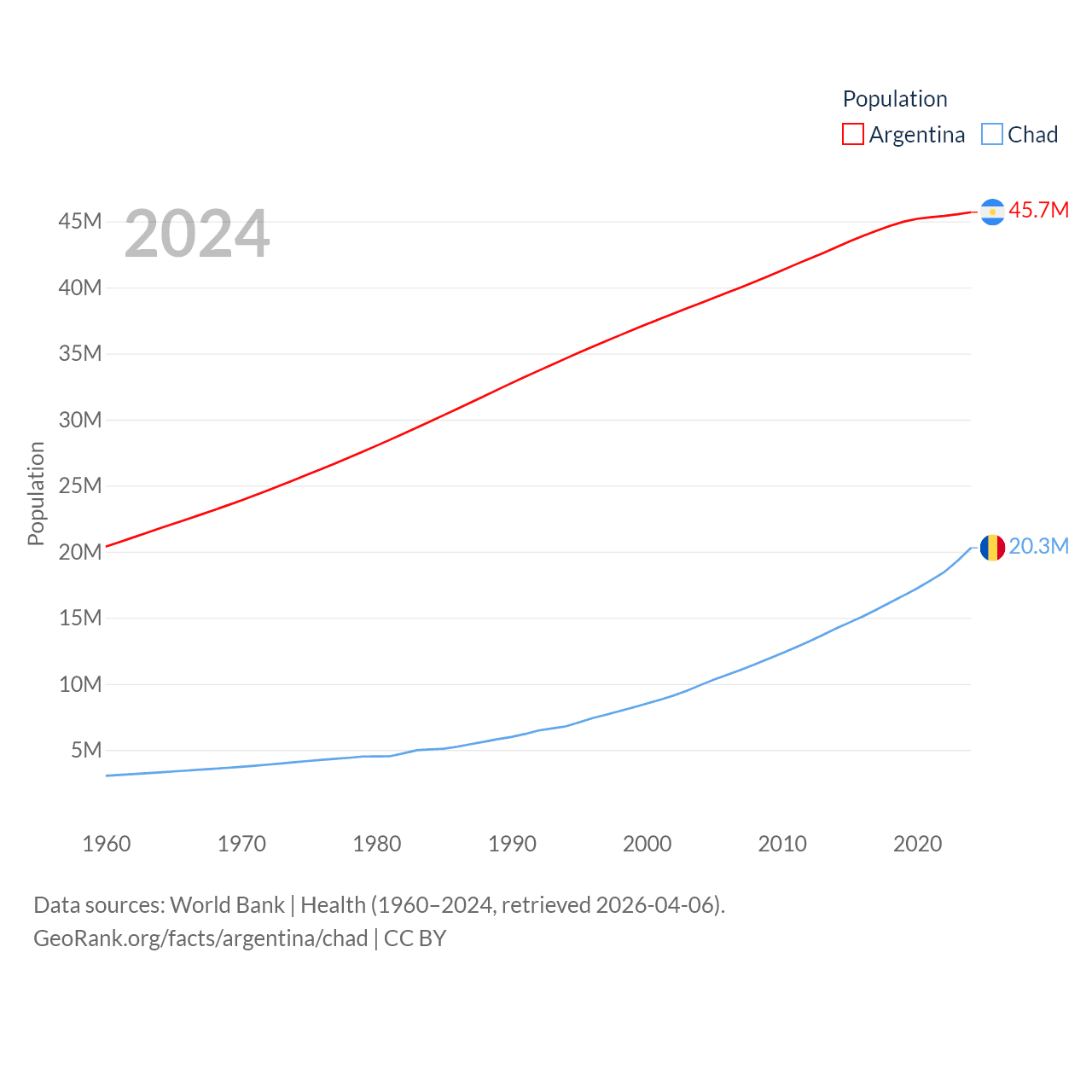 Argentina has a population of 45.7M (ranked 35/197), compared with 20.3M in Chad (ranked 65/197). Argentina's land area is 1,056,642 sq mi versus 486,180 sq mi for Chad (ranked 8th vs. 21st).