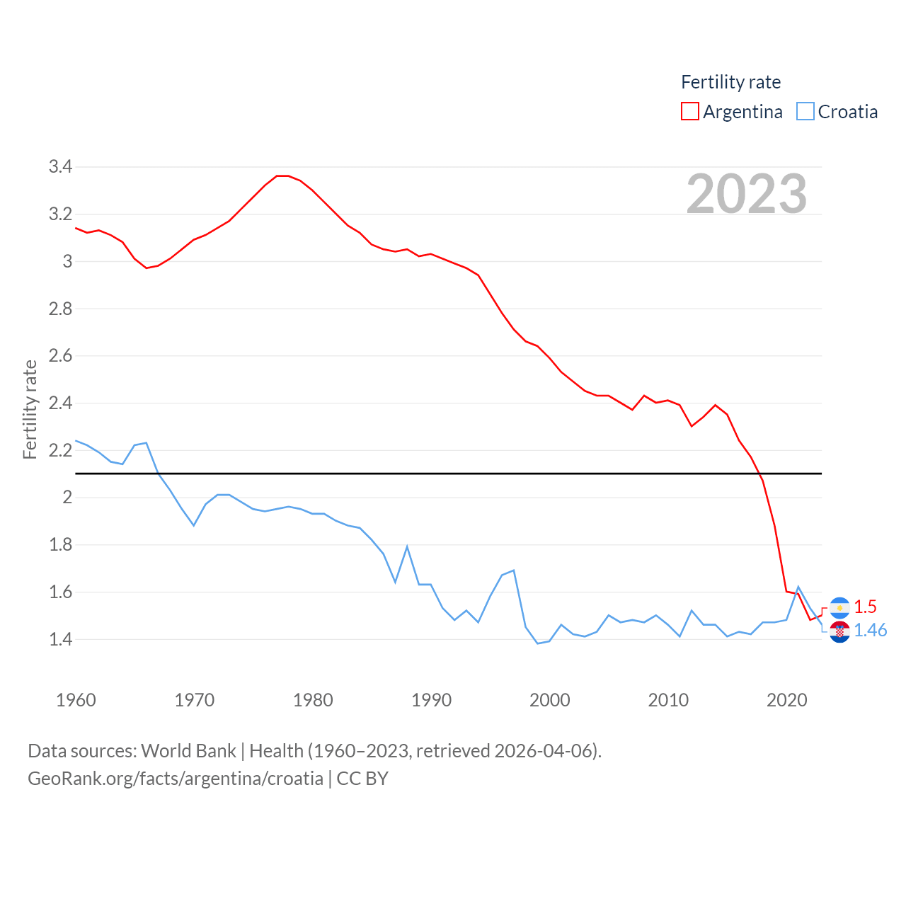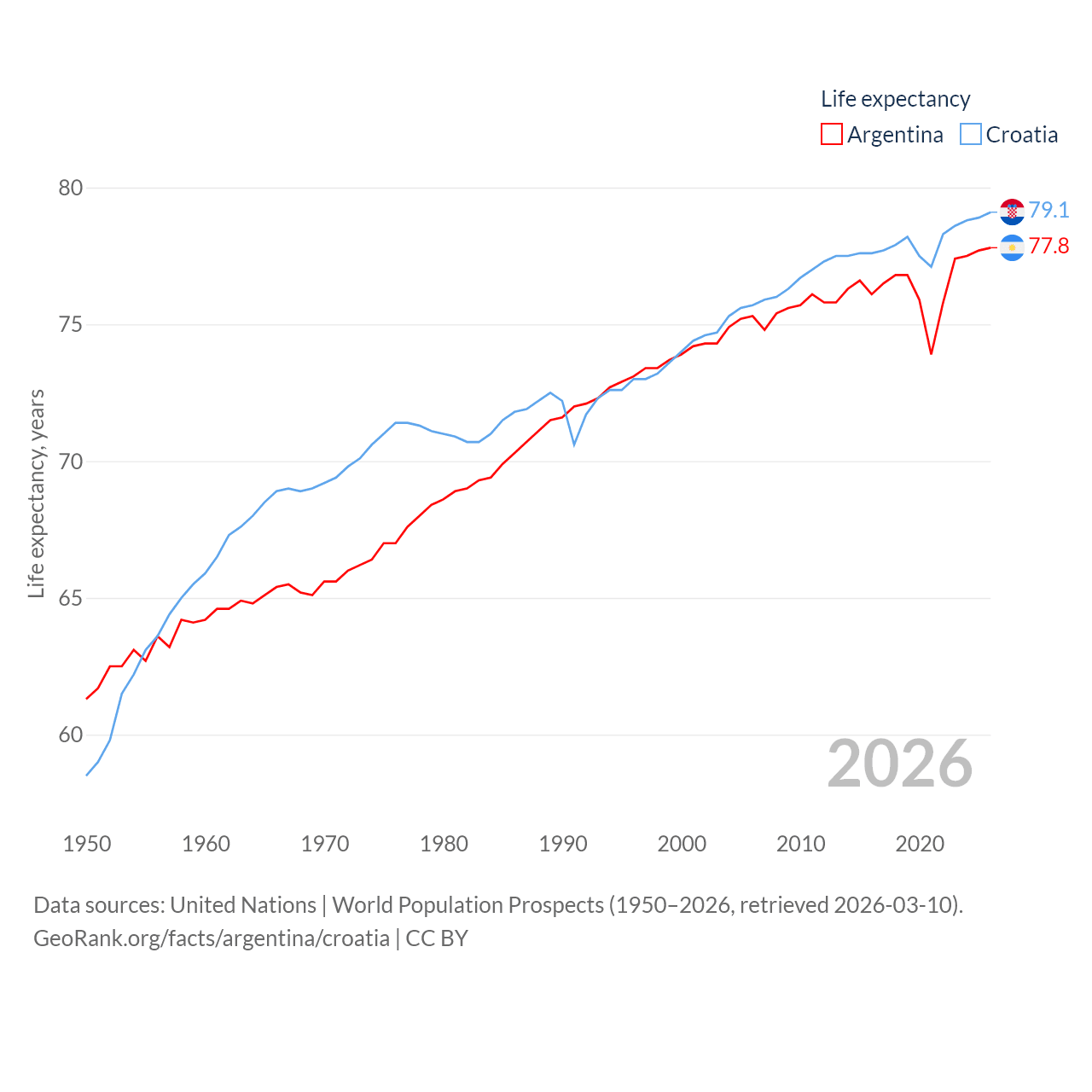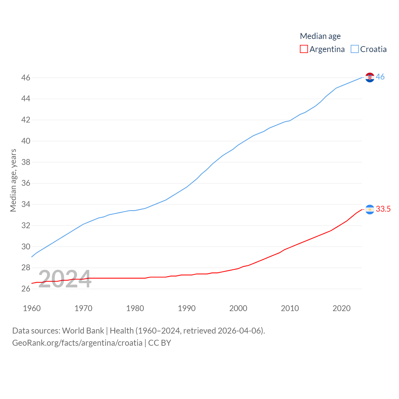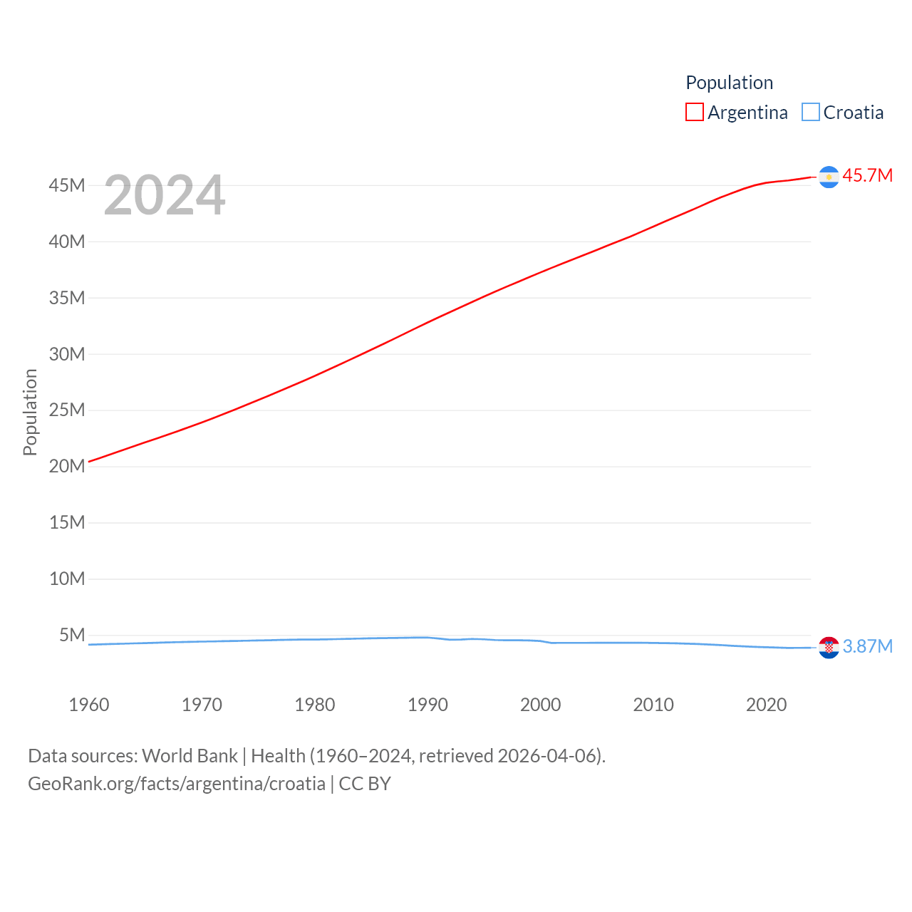 Argentina has a population of 45.7M (ranked 35/197), compared with 3.87M in Croatia (ranked 129/197). Argentina's land area is 1,056,642 sq mi versus 21,606 sq mi for Croatia (ranked 8th vs. 123rd).