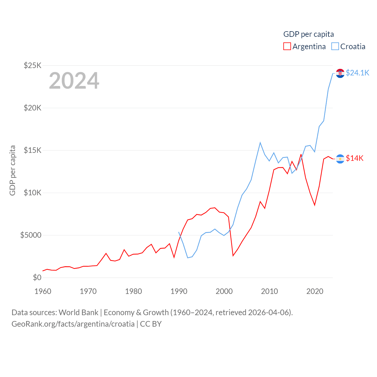 By GDP, Argentina ranks 24/197 ($638B) and Croatia ranks 75/197 ($93B). By GDP per capita, Argentina ranks 72/197 ($13,970), while Croatia ranks 50/197 ($24,050).