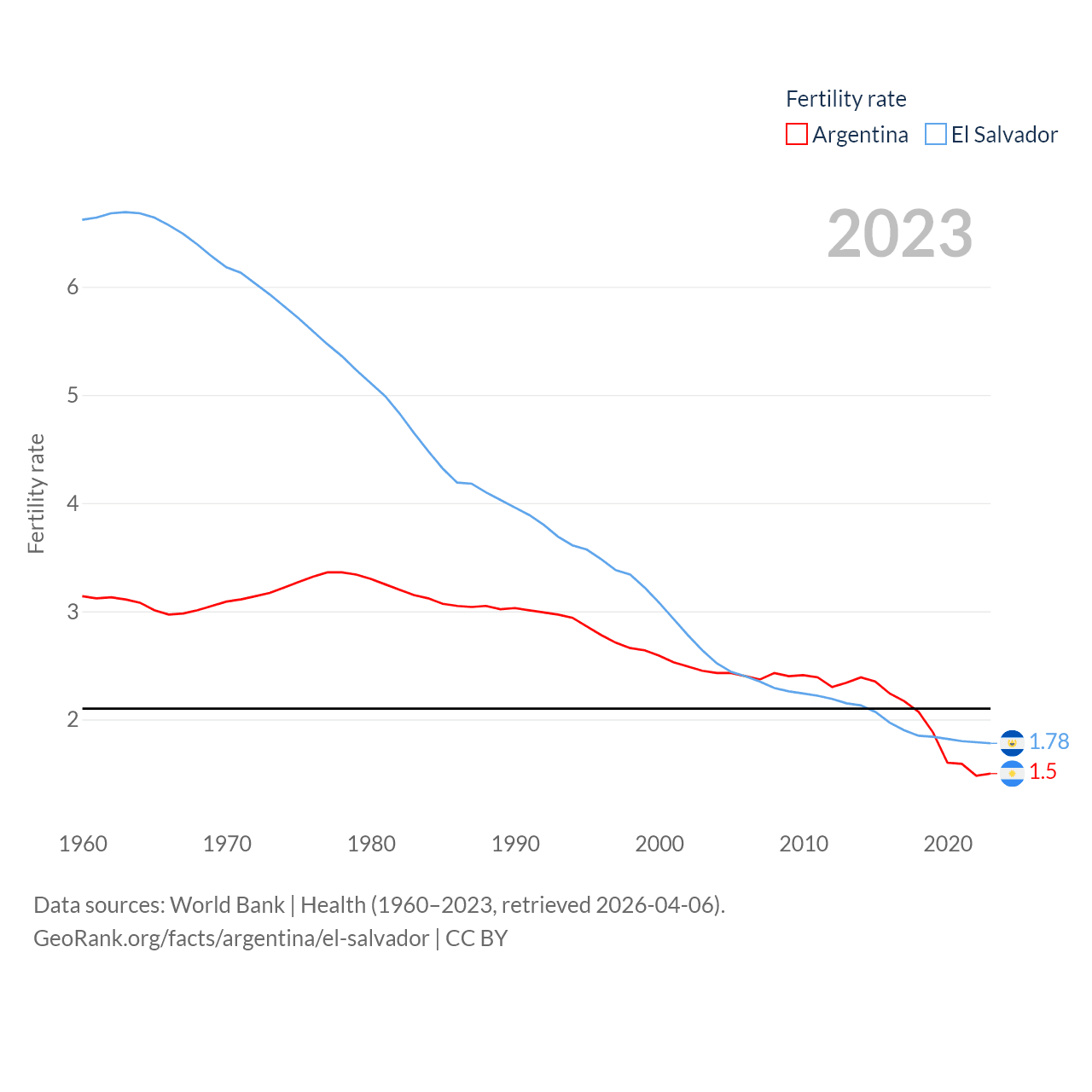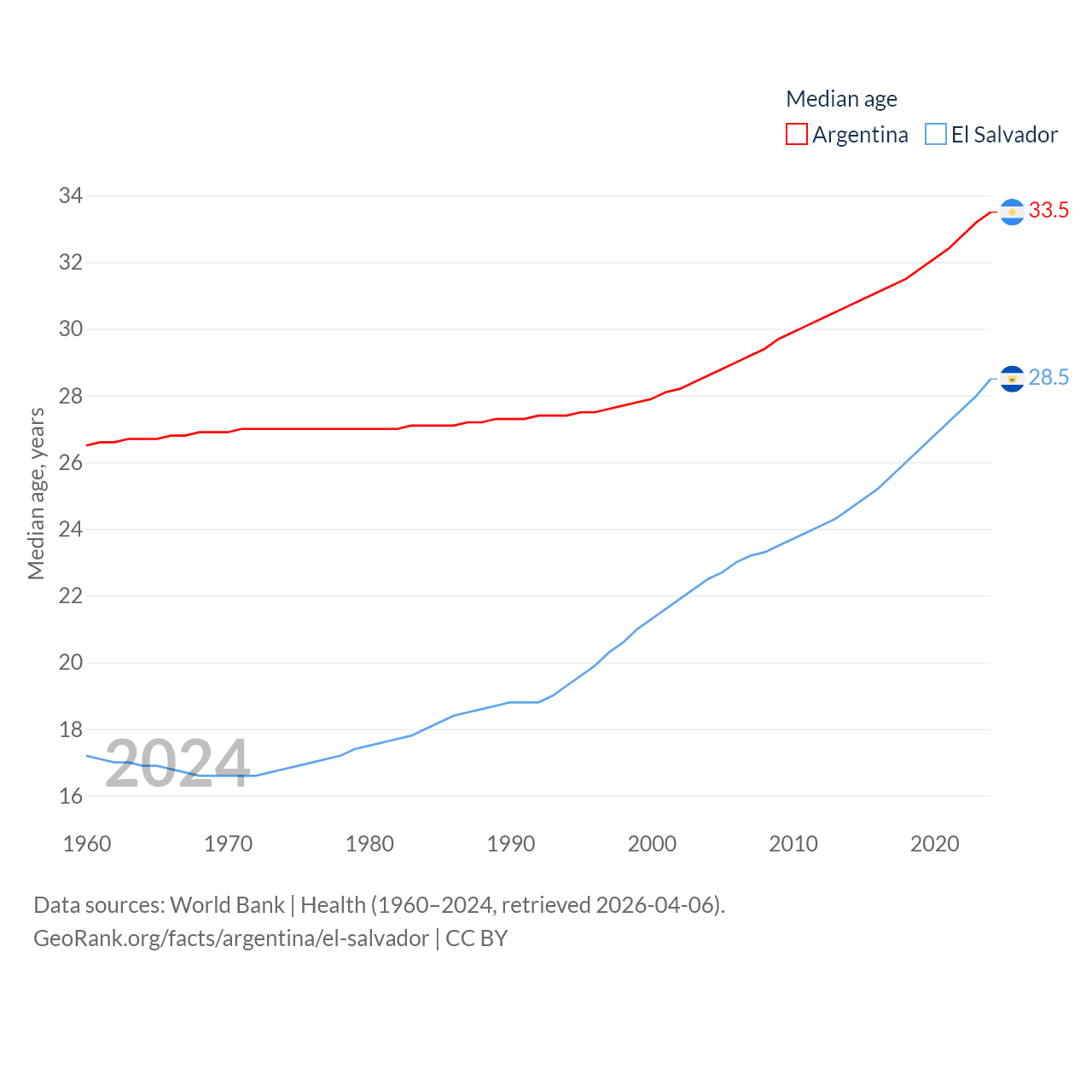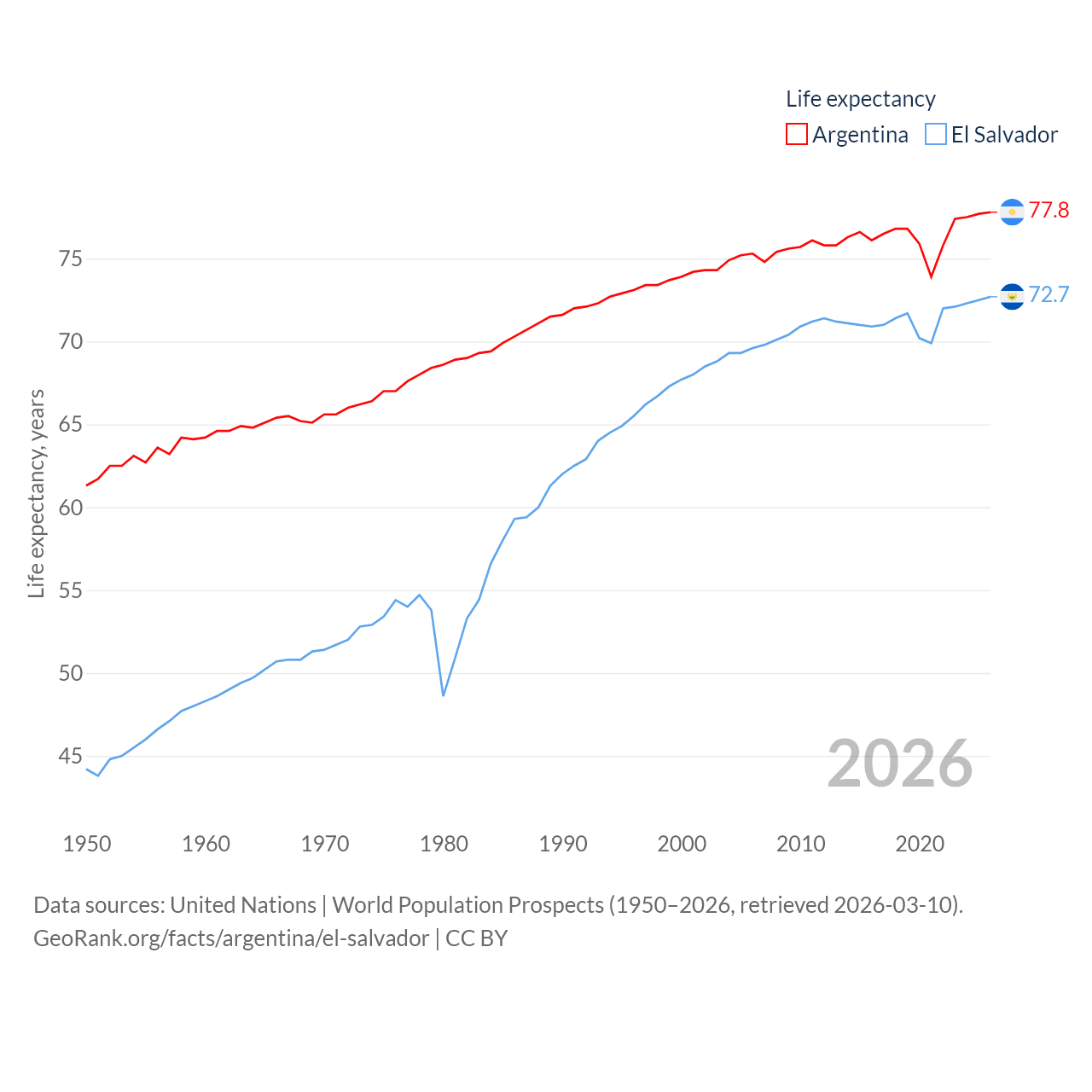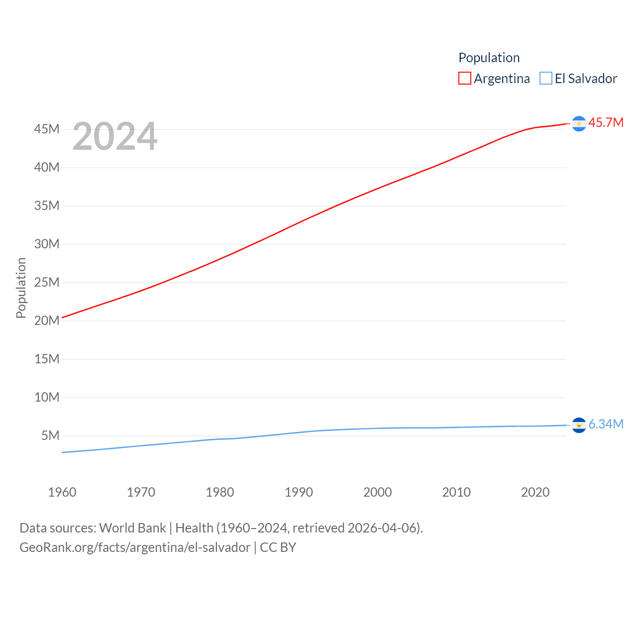 Argentina has a population of 45.7M (ranked 35/197), compared with 6.34M in El Salvador (ranked 111/197). Argentina's land area is 1,056,642 sq mi versus 8,000 sq mi for El Salvador (ranked 8th vs. 150th).