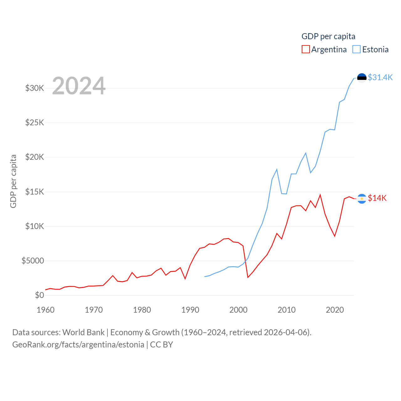 By GDP, Argentina ranks 24/197 ($638B) and Estonia ranks 100/197 ($43.1B). By GDP per capita, Argentina ranks 72/197 ($13,970), while Estonia ranks 40/197 ($31,428).