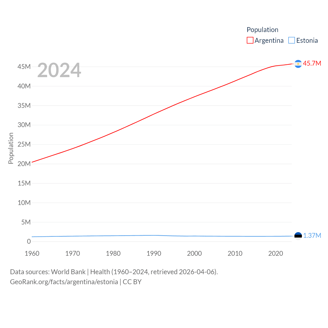 Argentina has a population of 45.7M (ranked 35/197), compared with 1.37M in Estonia (ranked 153/197). Argentina's land area is 1,056,642 sq mi versus 16,498 sq mi for Estonia (ranked 8th vs. 129th).