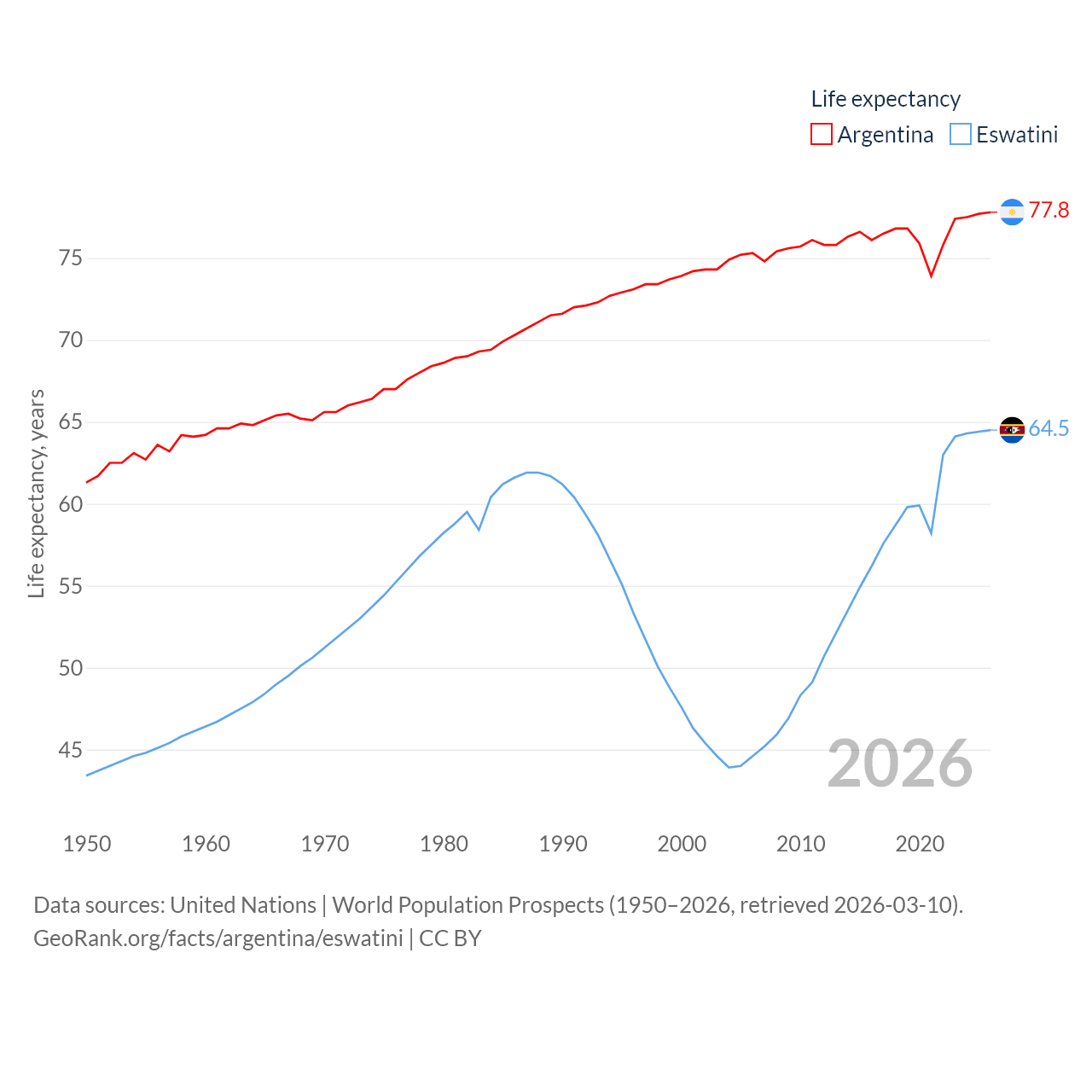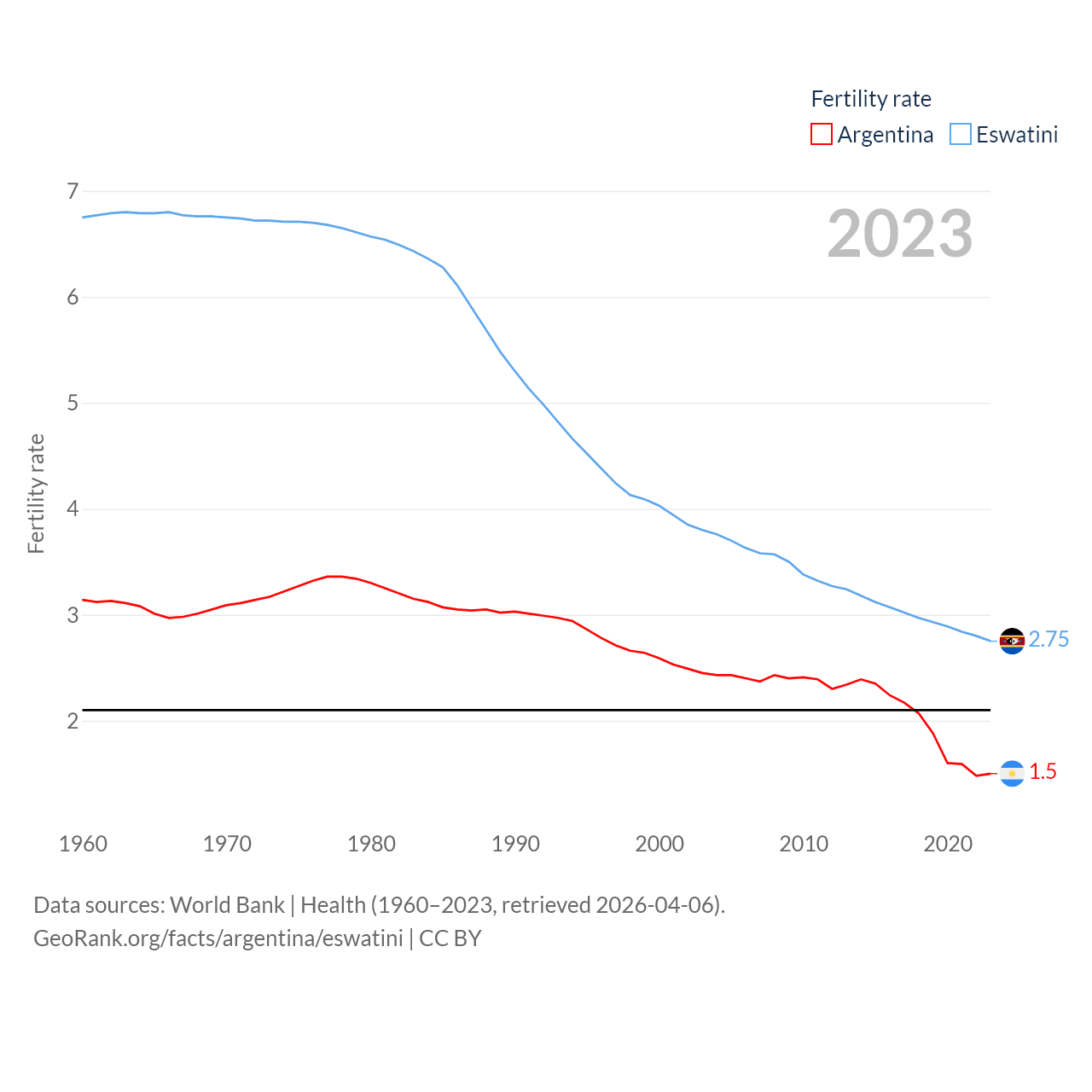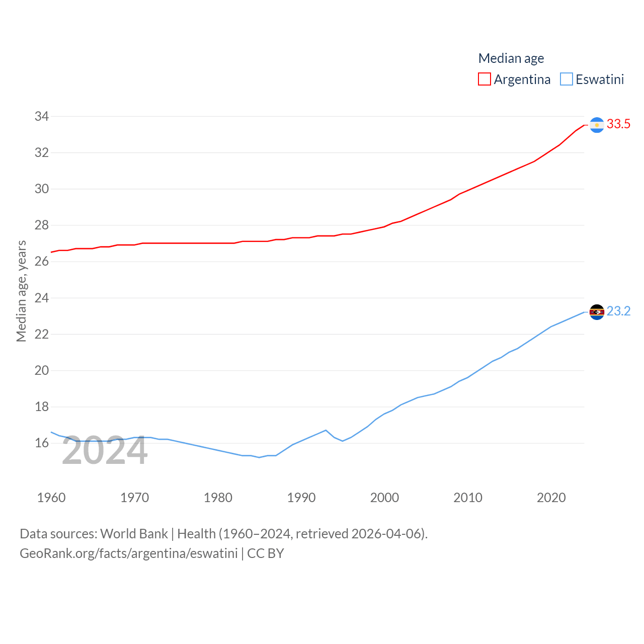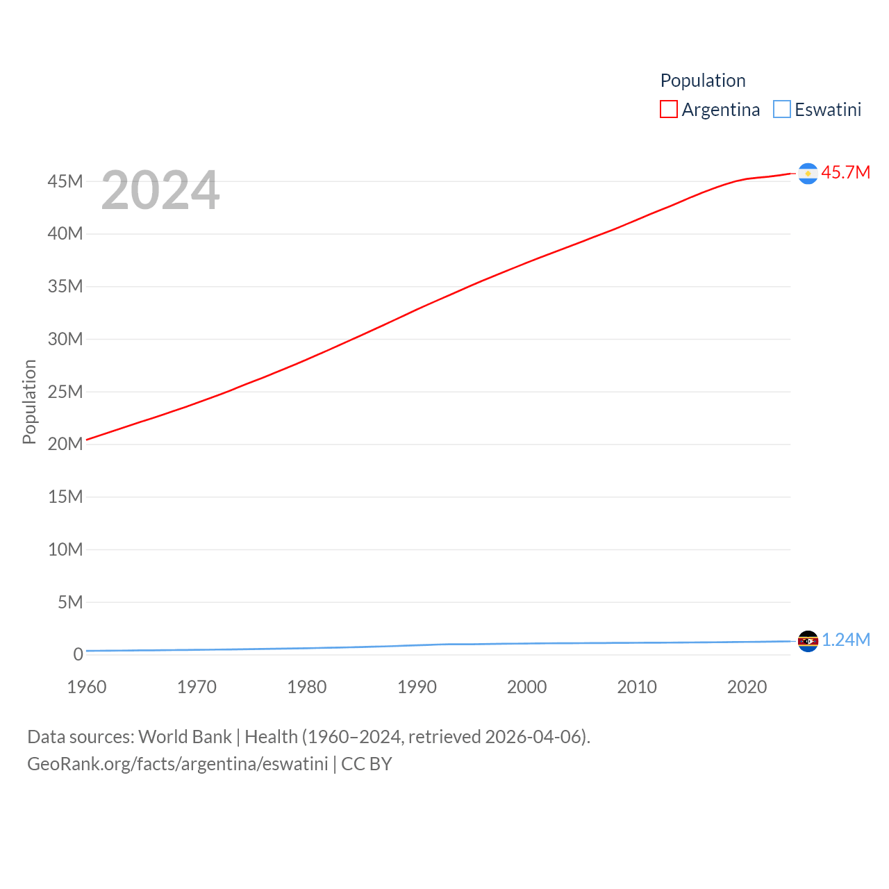 Argentina has a population of 45.7M (ranked 35/197), compared with 1.24M in Eswatini (ranked 157/197). Argentina's land area is 1,056,642 sq mi versus 6,641 sq mi for Eswatini (ranked 8th vs. 154th).