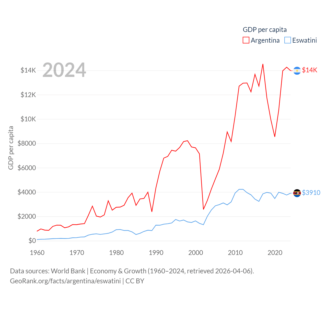 By GDP, Argentina ranks 24/197 ($638B) and Eswatini ranks 162/197 ($4.86B). By GDP per capita, Argentina ranks 72/197 ($13,970), while Eswatini ranks 131/197 ($3,910).
