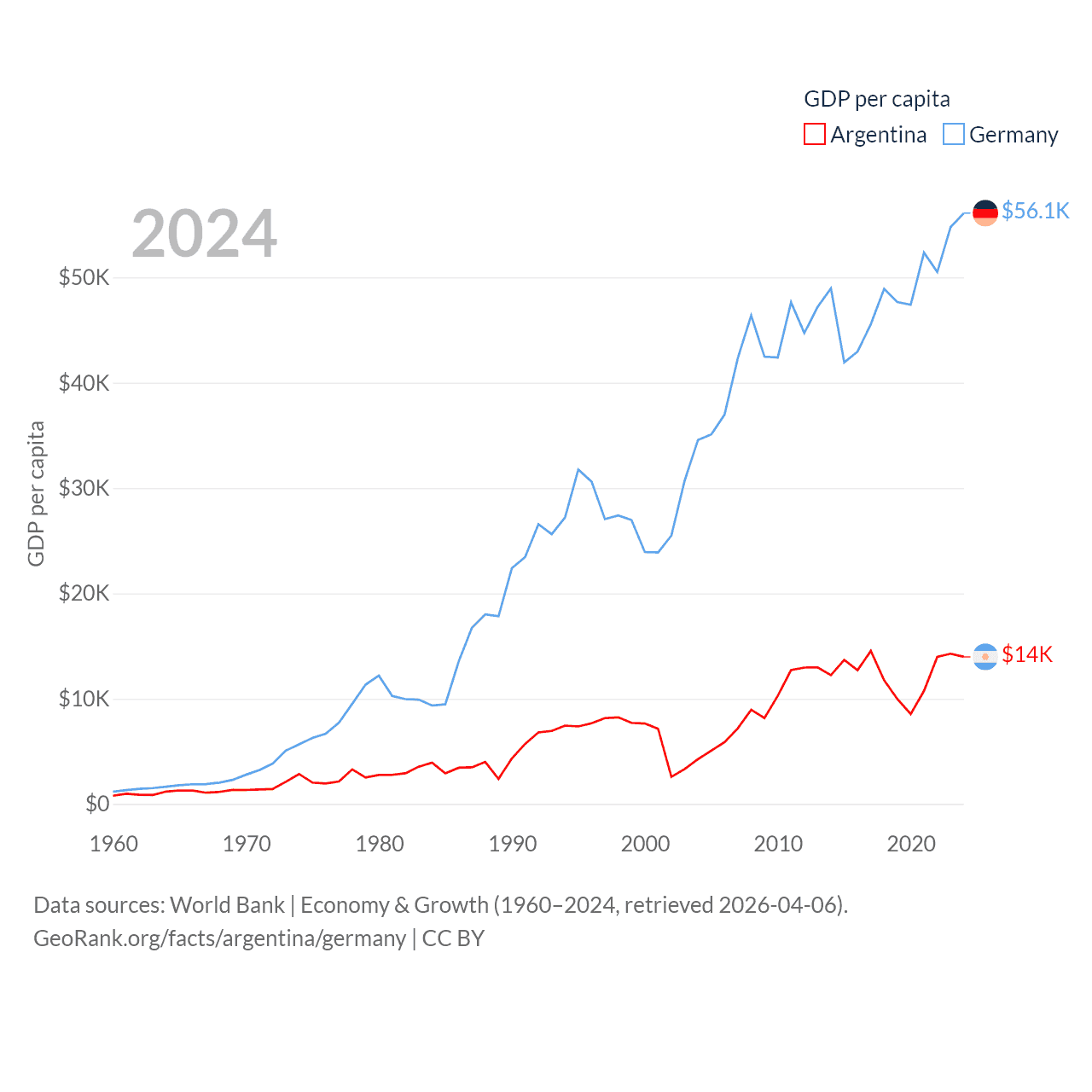 By GDP, Argentina ranks 24/197 ($638B) and Germany ranks 3/197 ($4.69T). By GDP per capita, Argentina ranks 72/197 ($13,970), while Germany ranks 19/197 ($56,104).