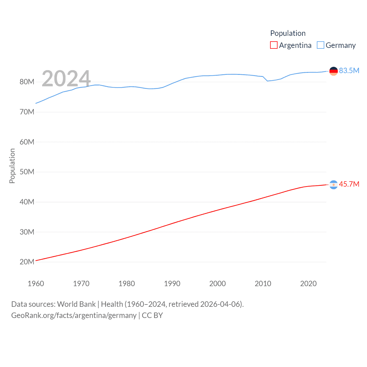 Argentina has a population of 45.7M (ranked 35/197), compared with 83.5M in Germany (ranked 19/197). Argentina's land area is 1,056,642 sq mi versus 134,916 sq mi for Germany (ranked 8th vs. 63rd).