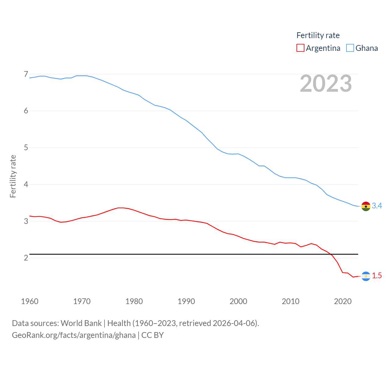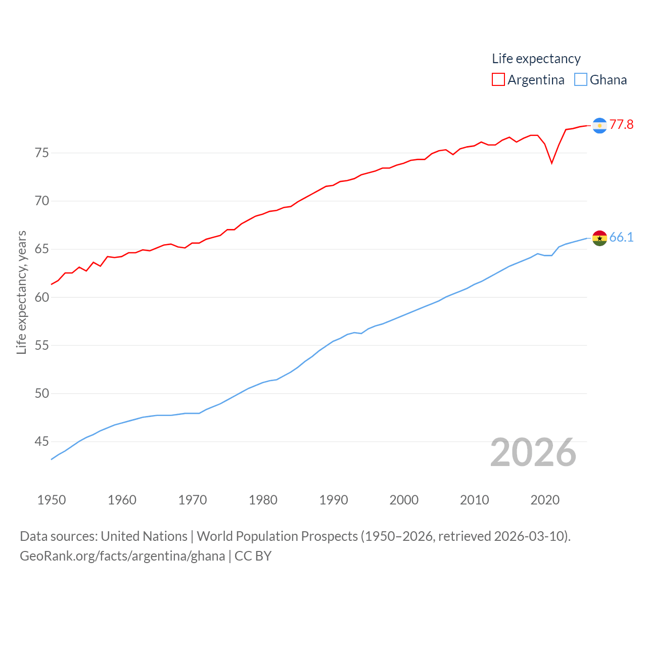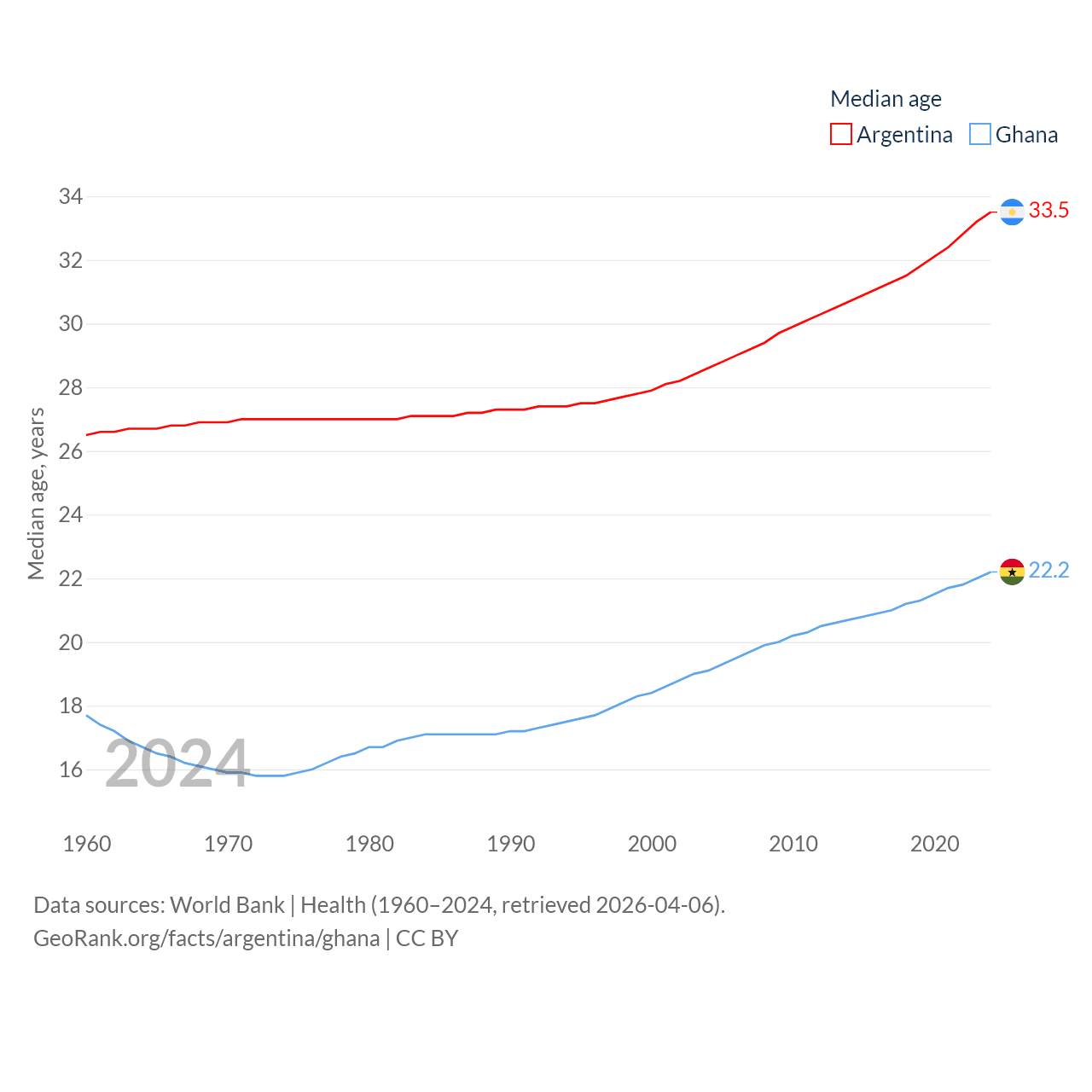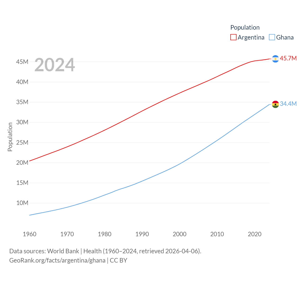 Argentina has a population of 45.7M (ranked 35/197), compared with 34.4M in Ghana (ranked 47/197). Argentina's land area is 1,056,642 sq mi versus 87,851 sq mi for Ghana (ranked 8th vs. 81st).