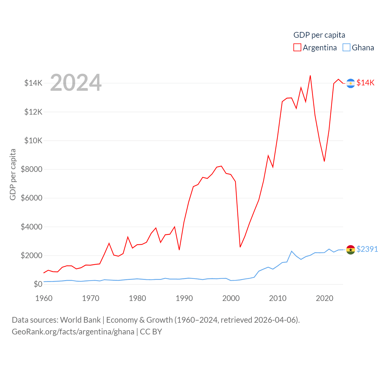 By GDP, Argentina ranks 24/197 ($638B) and Ghana ranks 80/197 ($82.3B). By GDP per capita, Argentina ranks 72/197 ($13,970), while Ghana ranks 151/197 ($2,391).