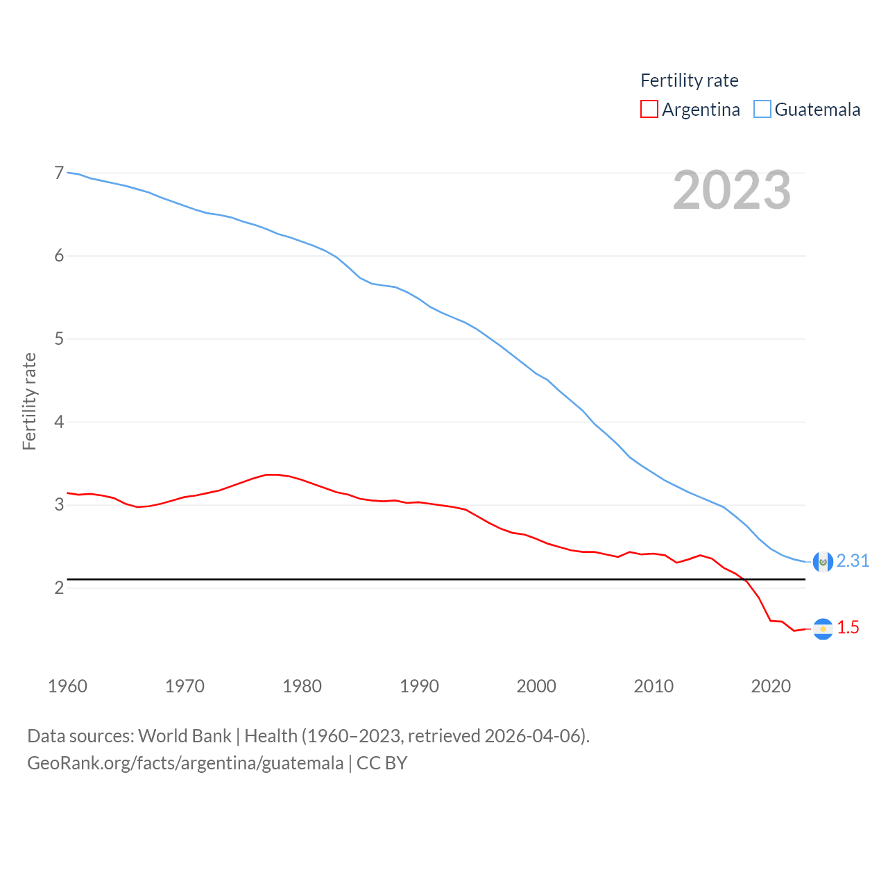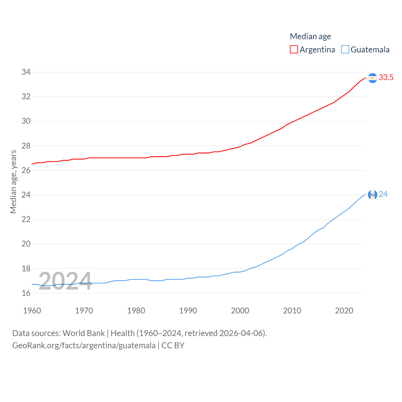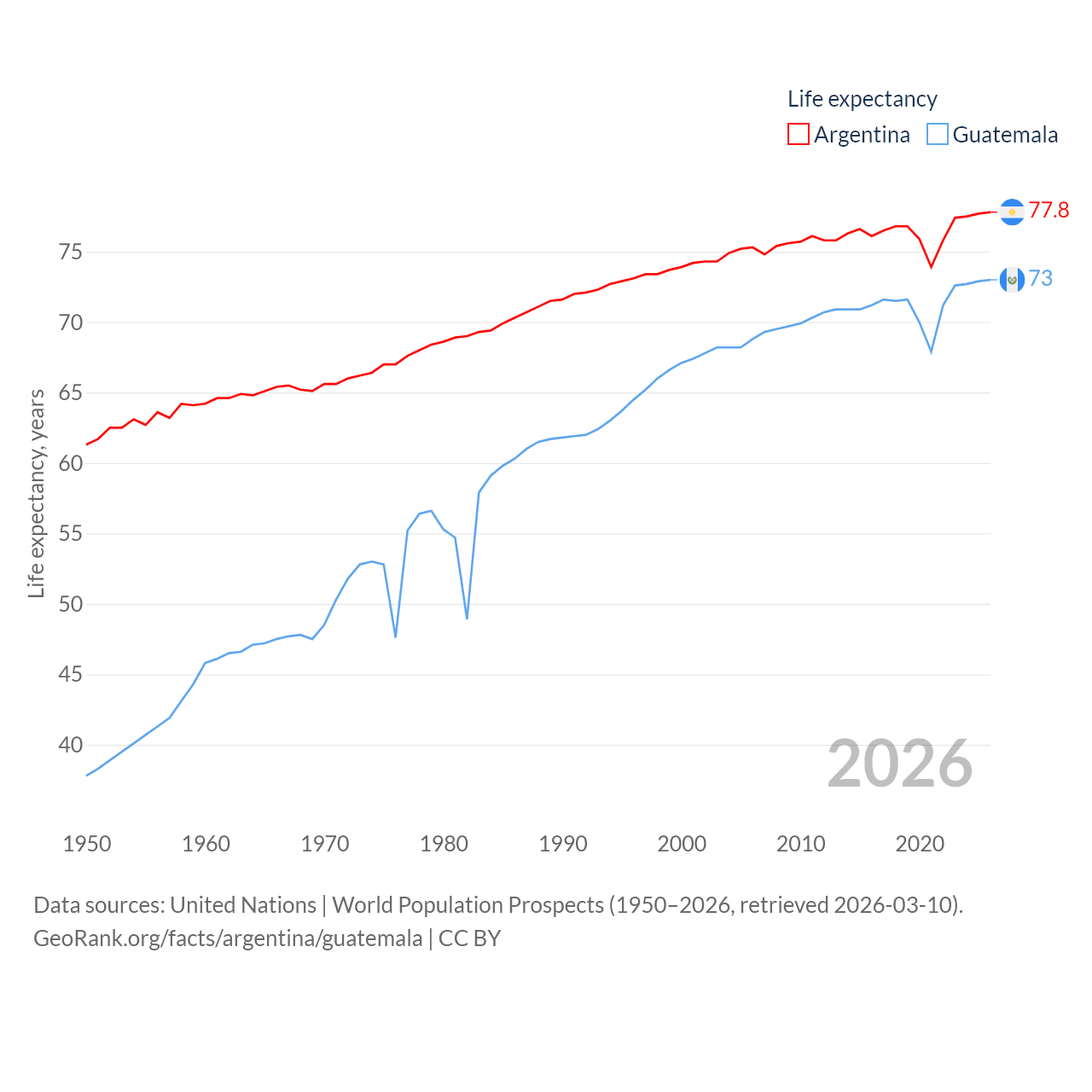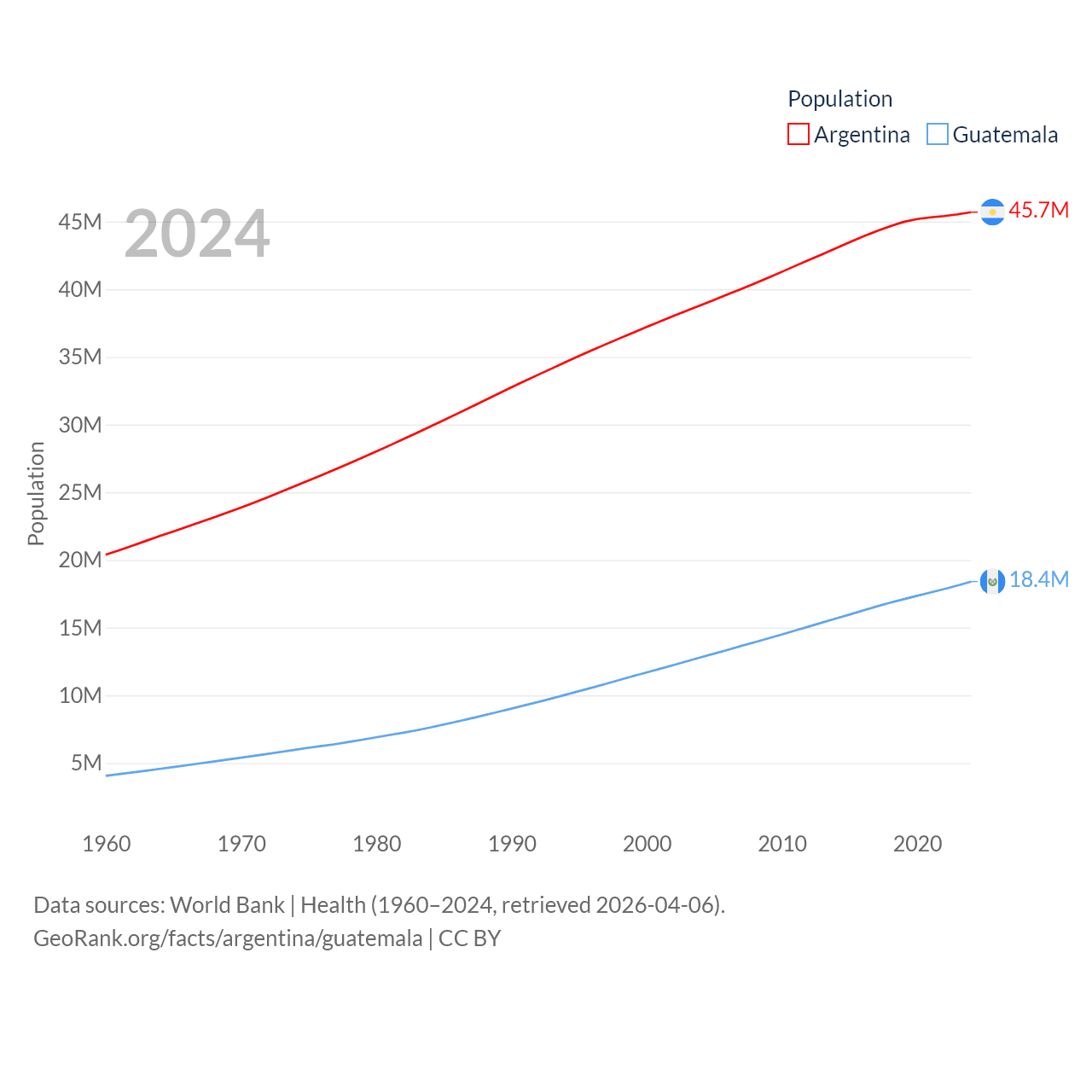 Argentina has a population of 45.7M (ranked 35/197), compared with 18.4M in Guatemala (ranked 70/197). Argentina's land area is 1,056,642 sq mi versus 41,375 sq mi for Guatemala (ranked 8th vs. 102nd).