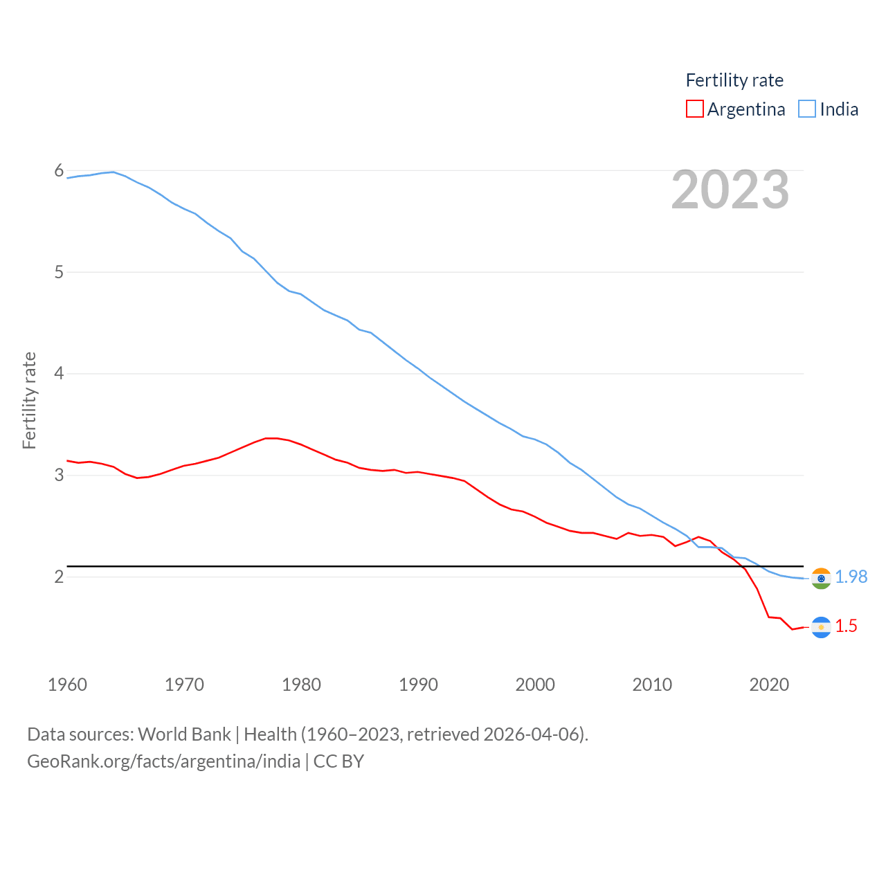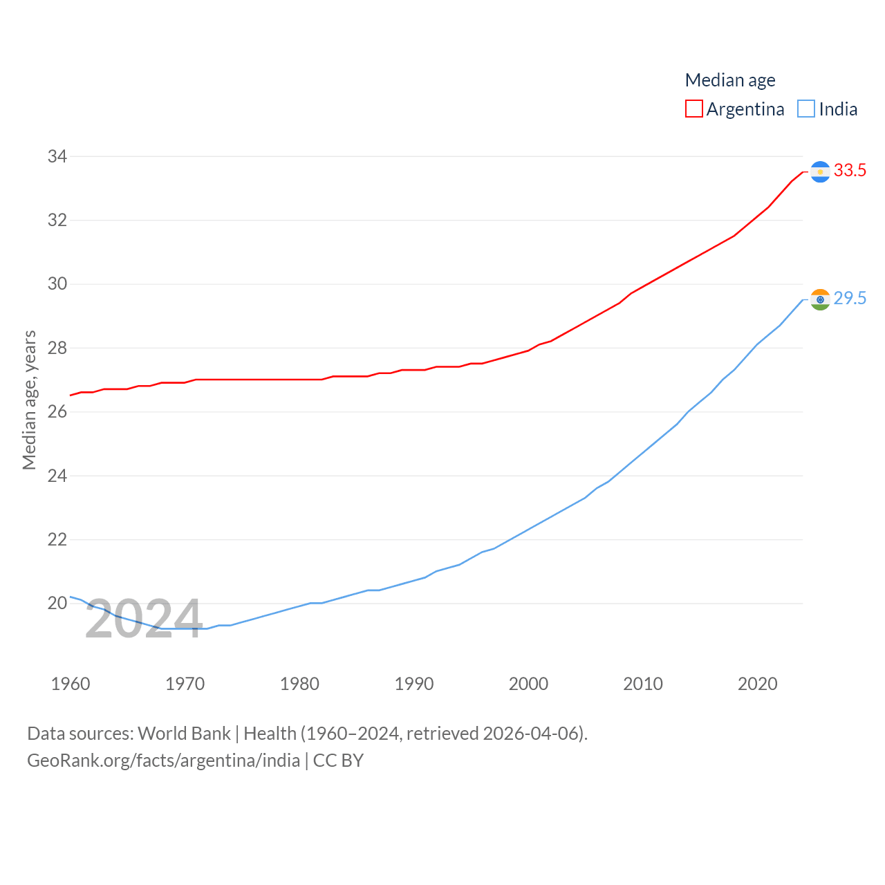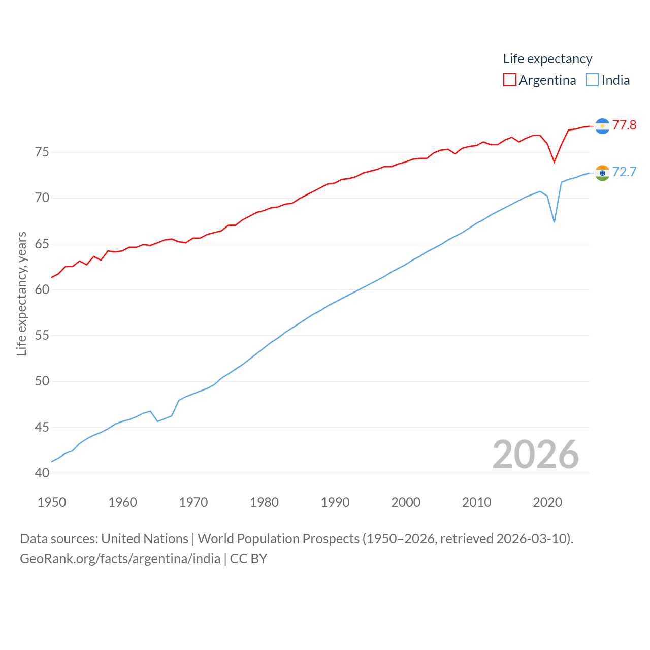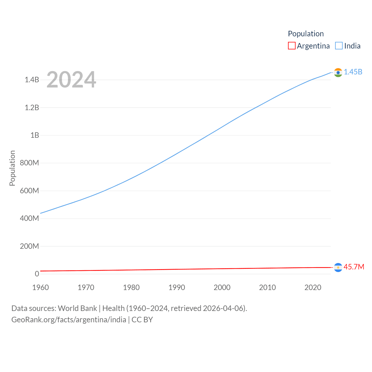 Argentina has a population of 45.7M (ranked 35/197), compared with 1.45B in India (ranked 1/197). Argentina's land area is 1,056,642 sq mi versus 1,147,955 sq mi for India (ranked 8th vs. 7th).