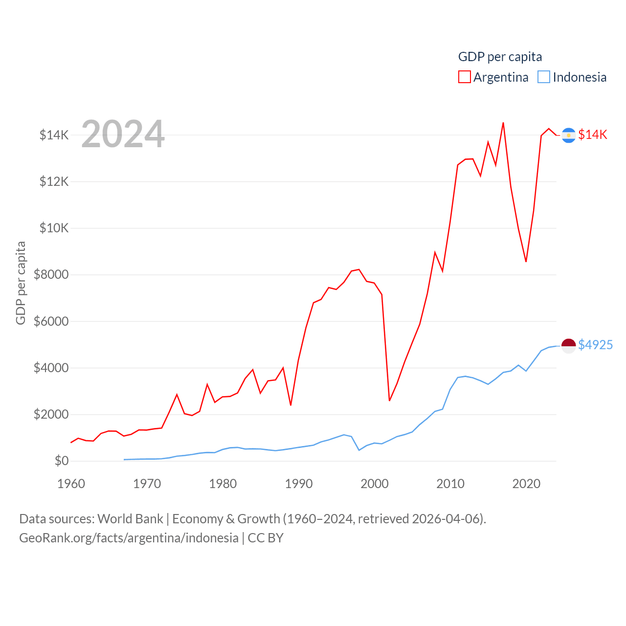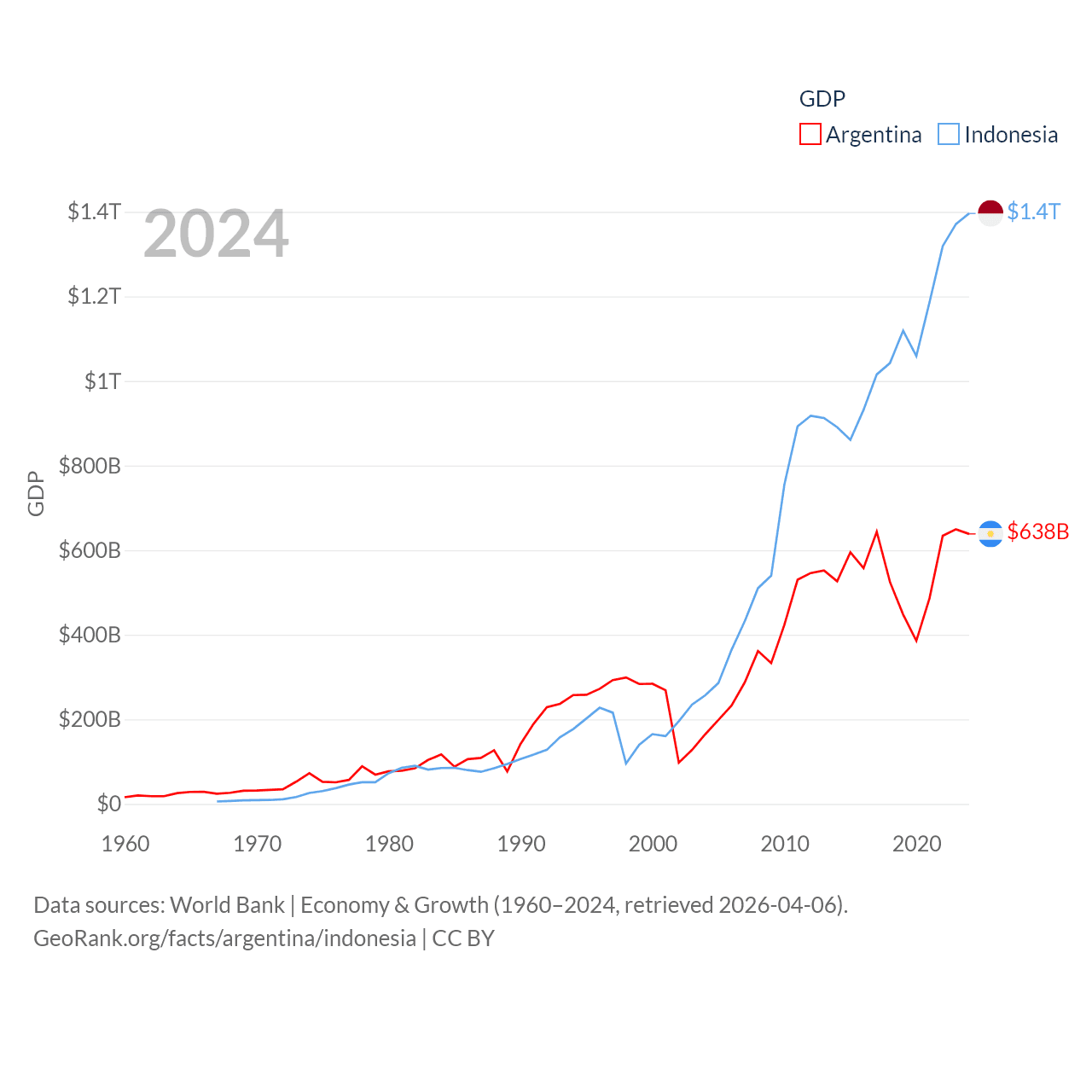 By GDP, Argentina ranks 24/197 ($638B) and Indonesia ranks 16/197 ($1.4T). By GDP per capita, Argentina ranks 72/197 ($13,970), while Indonesia ranks 121/197 ($4,925).