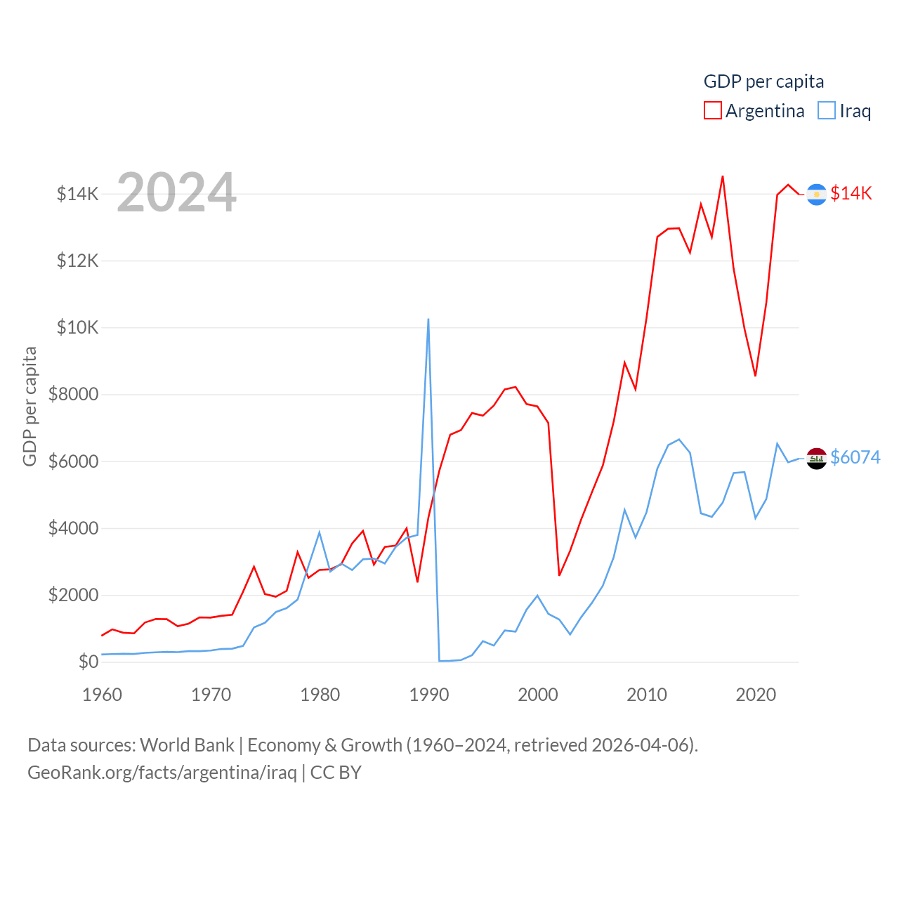 By GDP, Argentina ranks 24/197 ($638B) and Iraq ranks 50/197 ($280B). By GDP per capita, Argentina ranks 72/197 ($13,970), while Iraq ranks 113/197 ($6,074).
