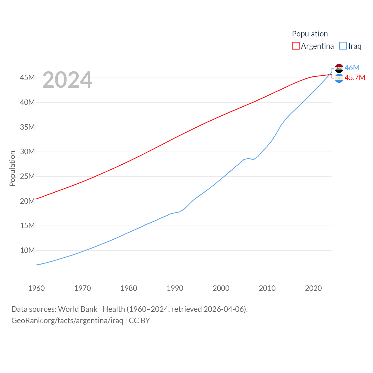 Argentina has a population of 45.7M (ranked 35/197), compared with 46M in Iraq (ranked 34/197). Argentina's land area is 1,056,642 sq mi versus 167,619 sq mi for Iraq (ranked 8th vs. 57th).
