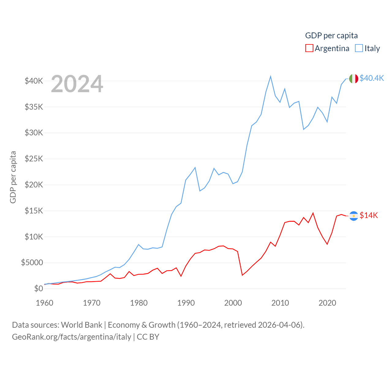 By GDP, Argentina ranks 24/197 ($638B) and Italy ranks 8/197 ($2.38T). By GDP per capita, Argentina ranks 72/197 ($13,970), while Italy ranks 29/197 ($40,385).