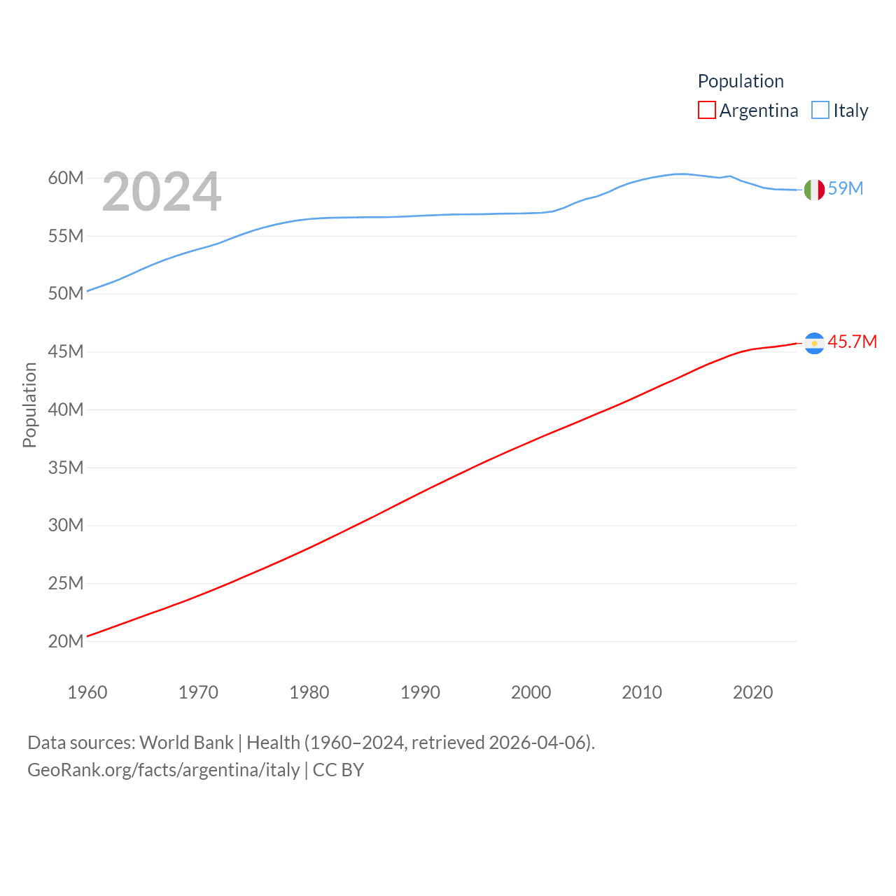 Argentina has a population of 45.7M (ranked 35/197), compared with 59M in Italy (ranked 25/197). Argentina's land area is 1,056,642 sq mi versus 114,178 sq mi for Italy (ranked 8th vs. 72nd).