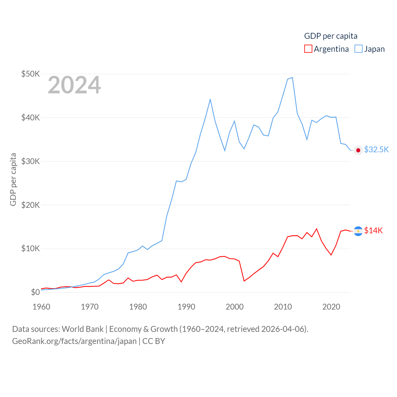 By GDP, Argentina ranks 24/197 ($638B) and Japan ranks 4/197 ($4.03T). By GDP per capita, Argentina ranks 72/197 ($13,970), while Japan ranks 38/197 ($32,487).