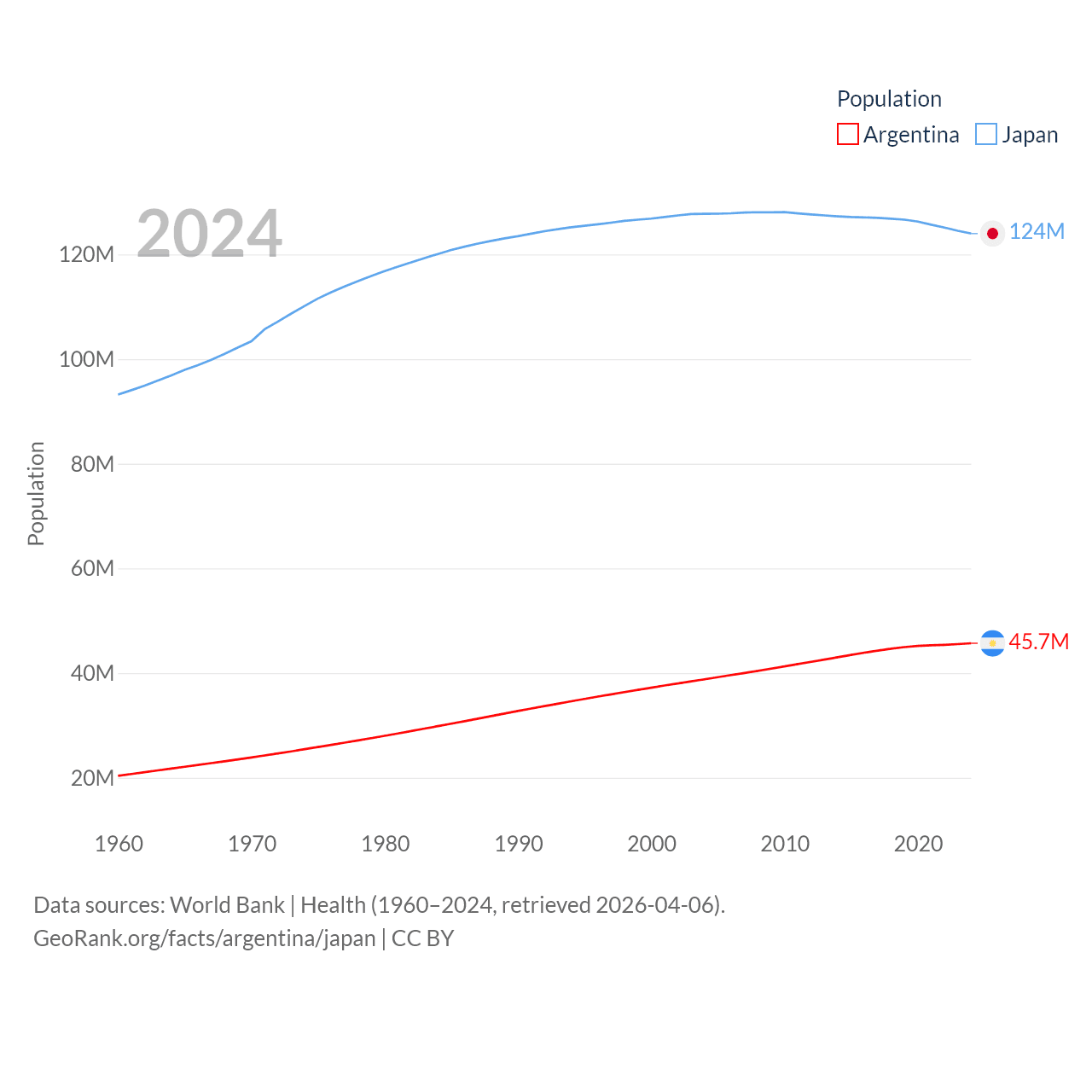 Argentina has a population of 45.7M (ranked 35/197), compared with 124M in Japan (ranked 12/197). Argentina's land area is 1,056,642 sq mi versus 140,761 sq mi for Japan (ranked 8th vs. 61st).