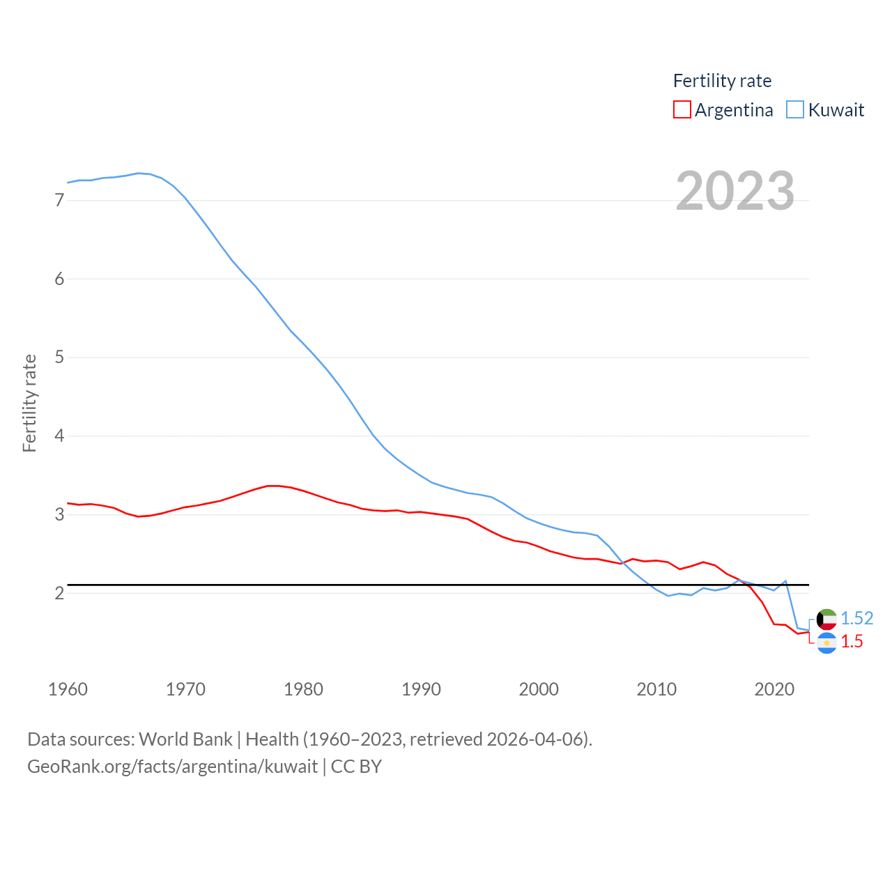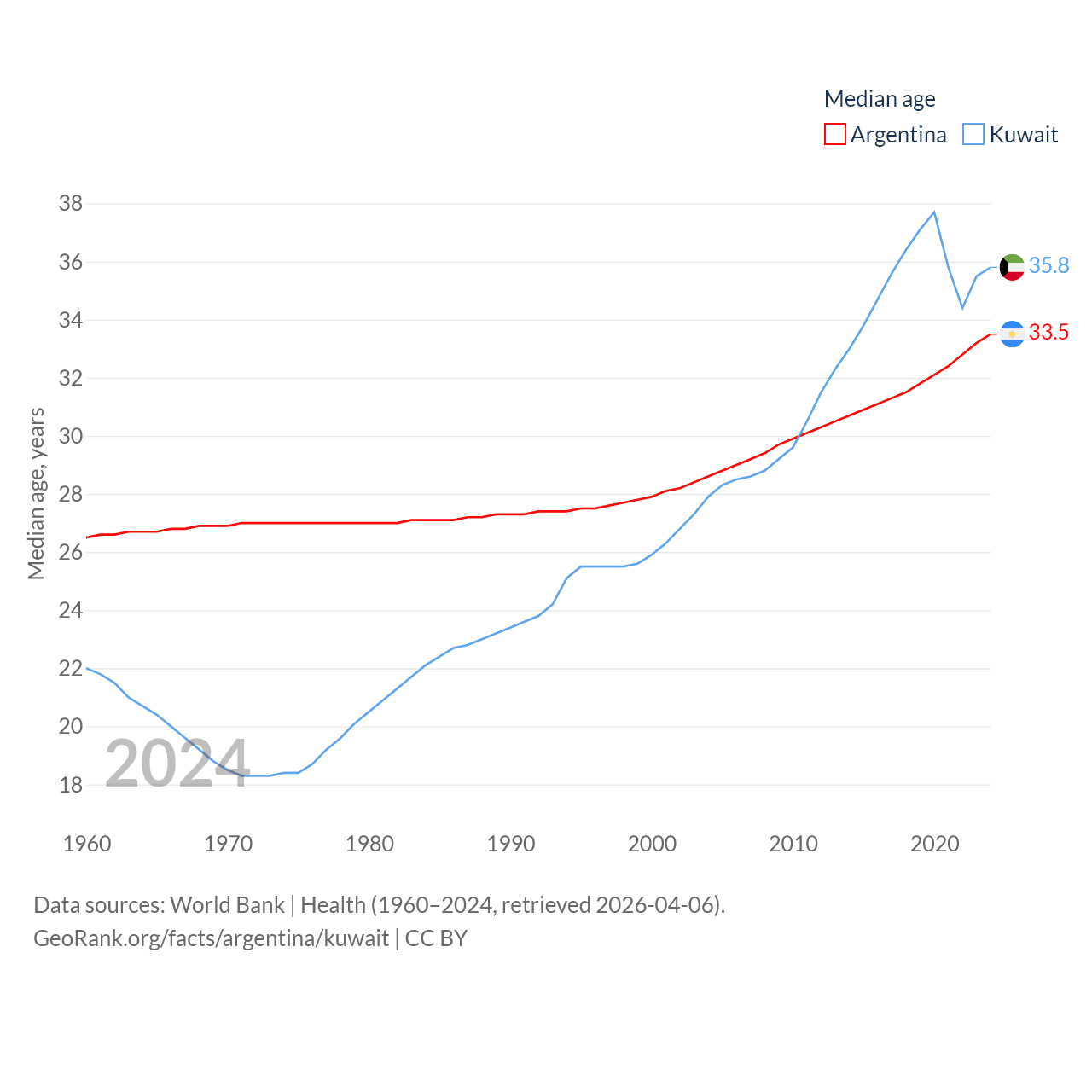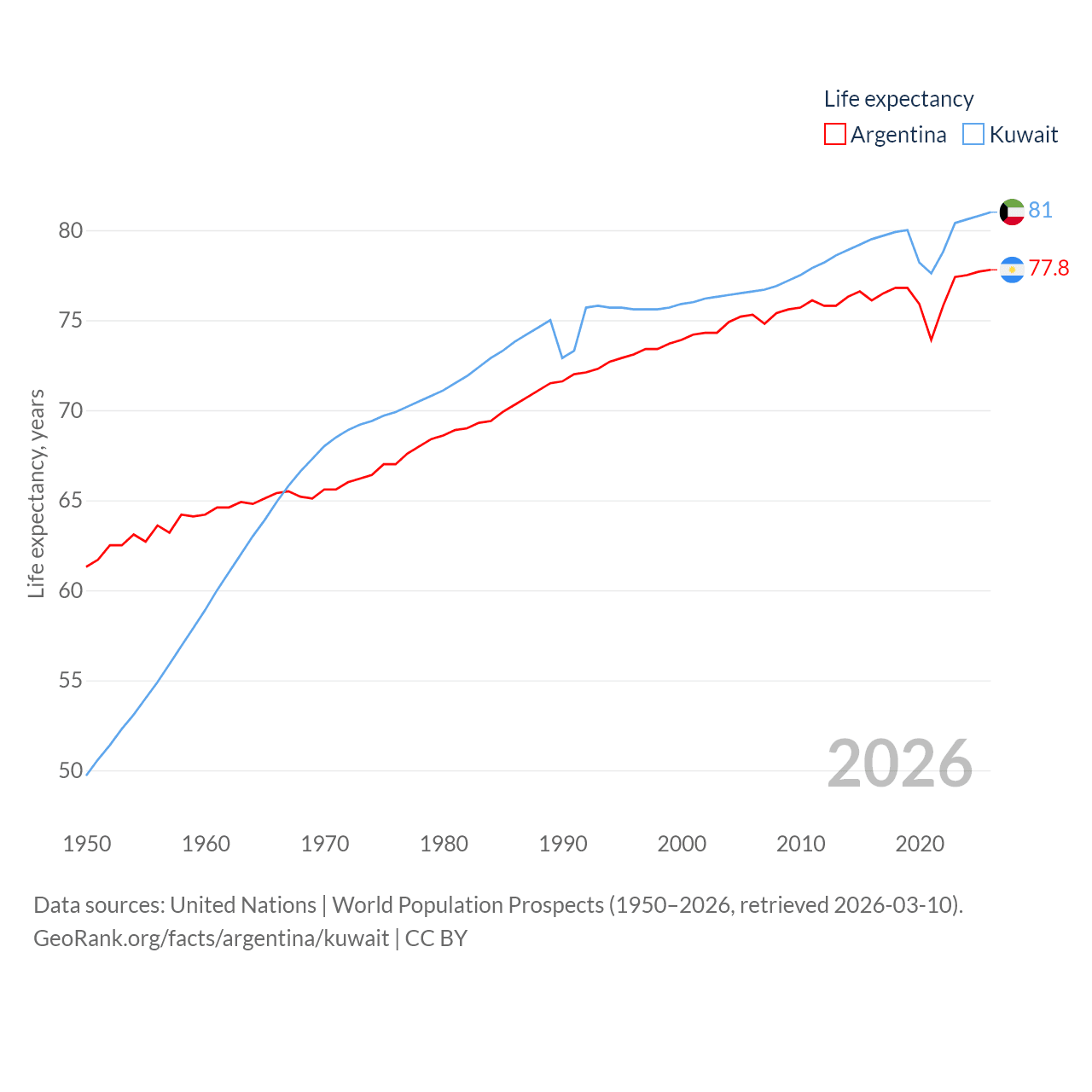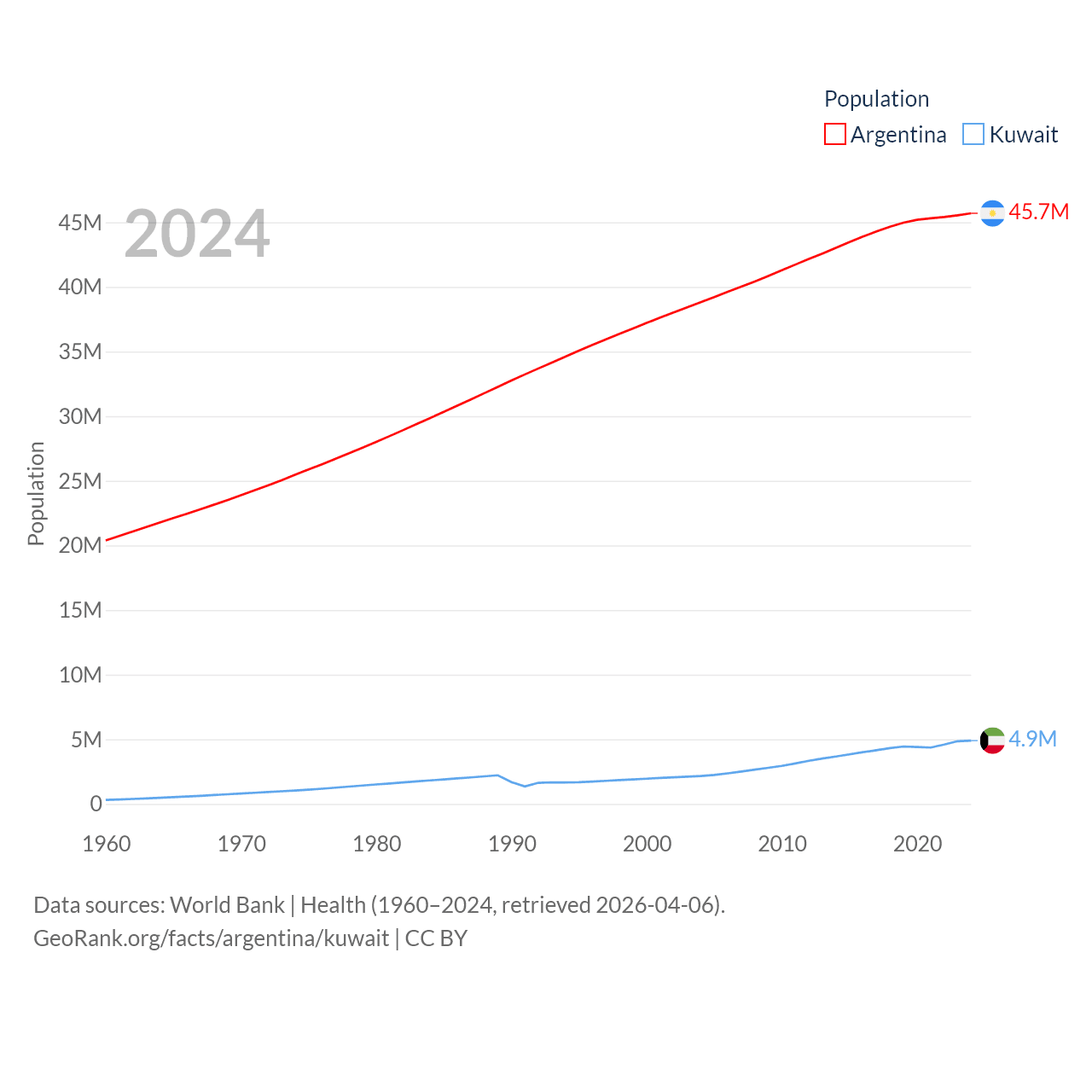 Argentina has a population of 45.7M (ranked 35/197), compared with 4.9M in Kuwait (ranked 127/197). Argentina's land area is 1,056,642 sq mi versus 6,880 sq mi for Kuwait (ranked 8th vs. 153rd).