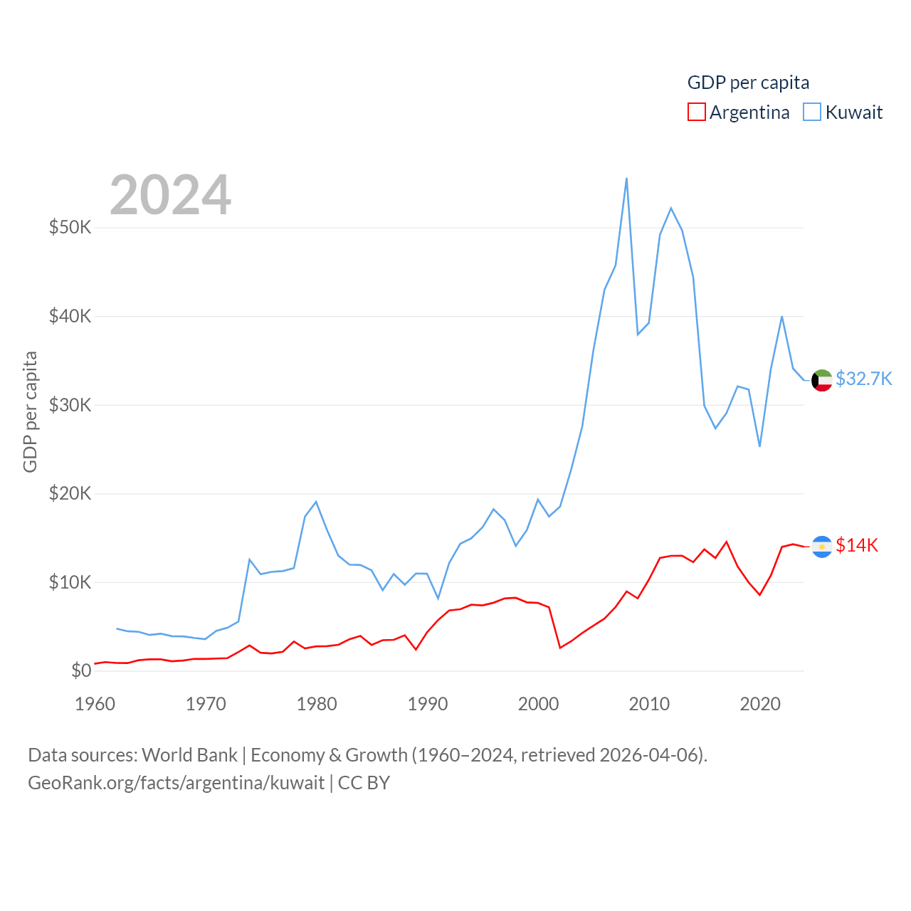 By GDP, Argentina ranks 24/197 ($638B) and Kuwait ranks 59/197 ($160B). By GDP per capita, Argentina ranks 72/197 ($13,970), while Kuwait ranks 37/197 ($32,718).