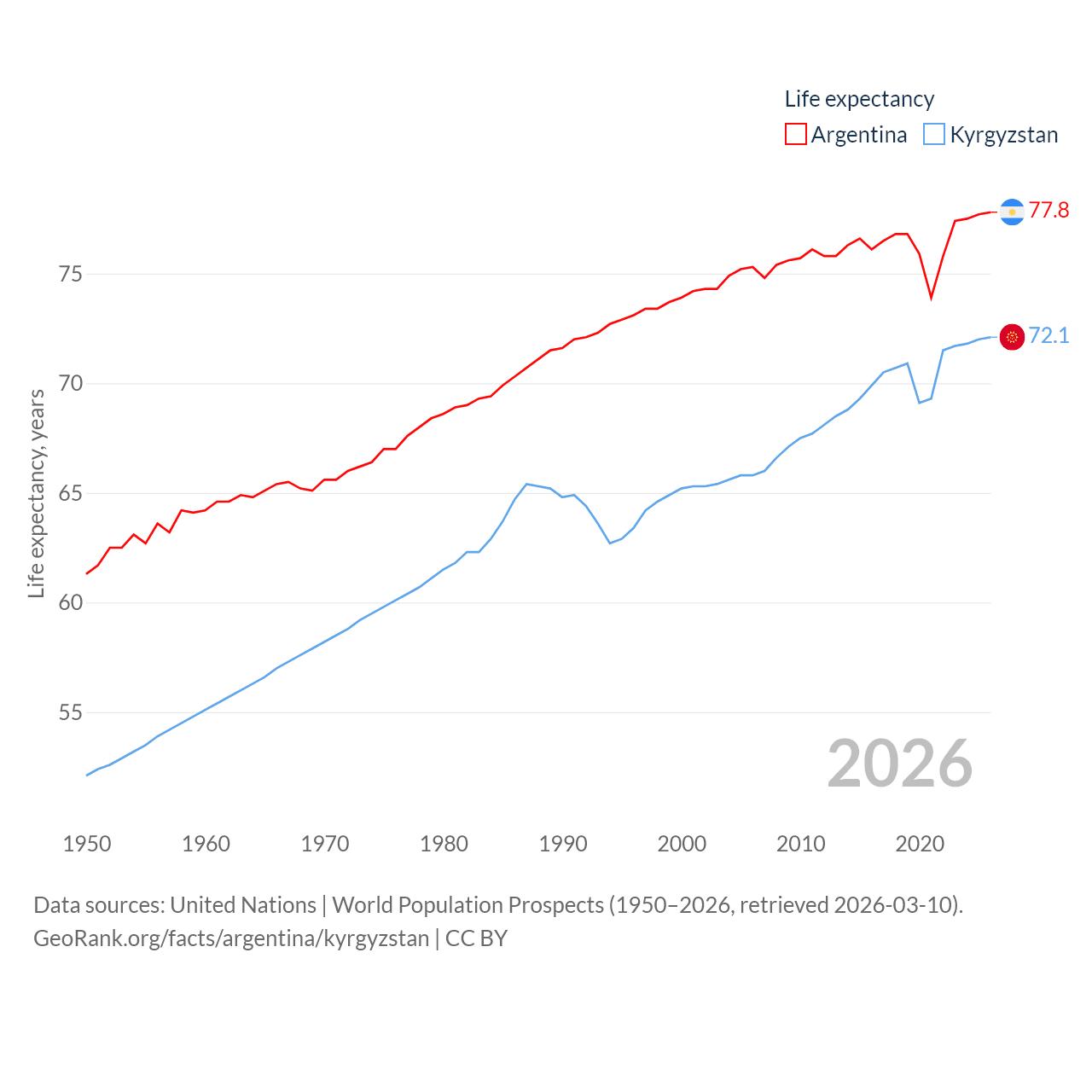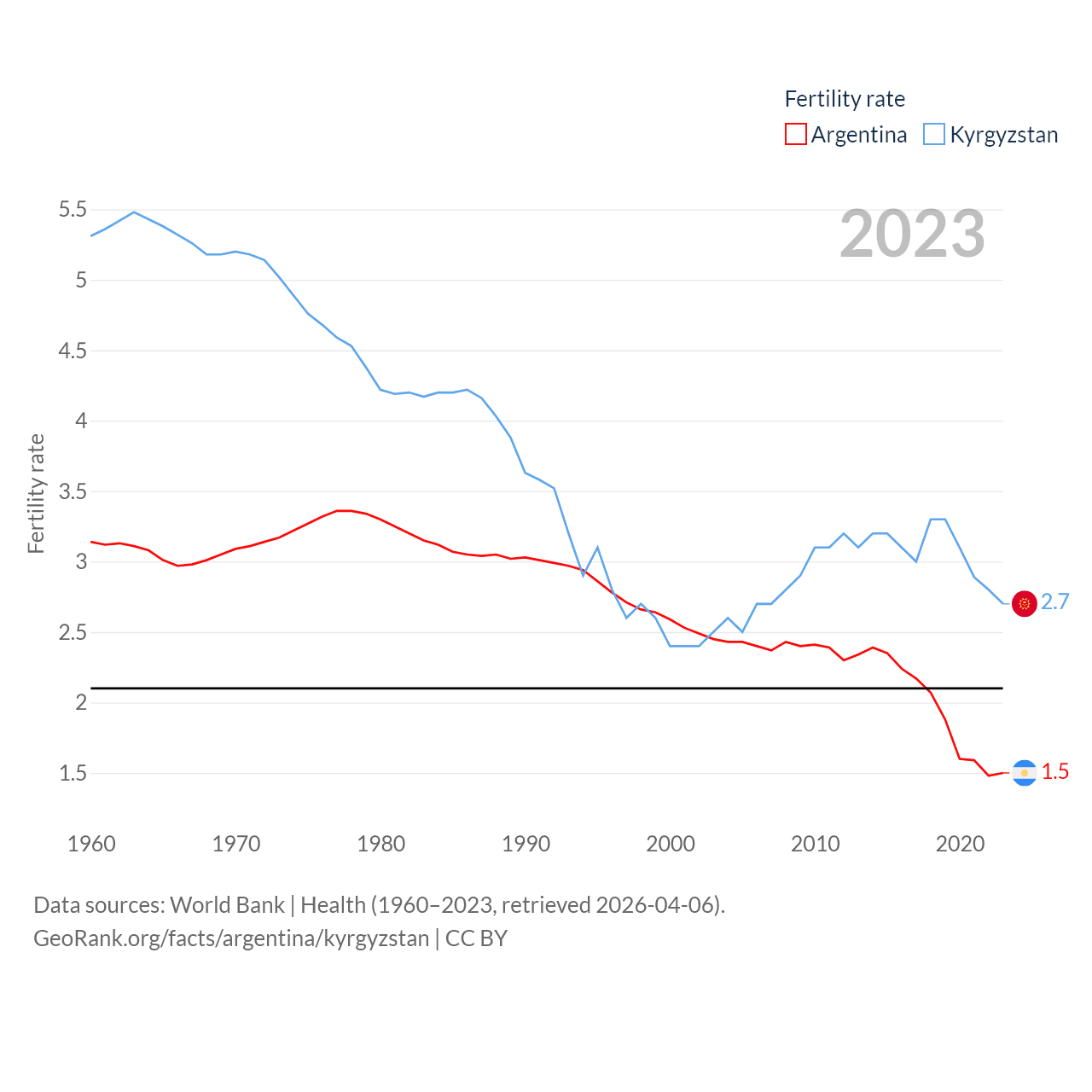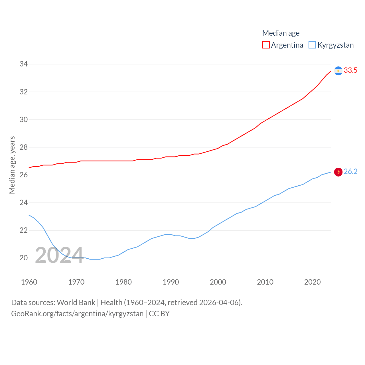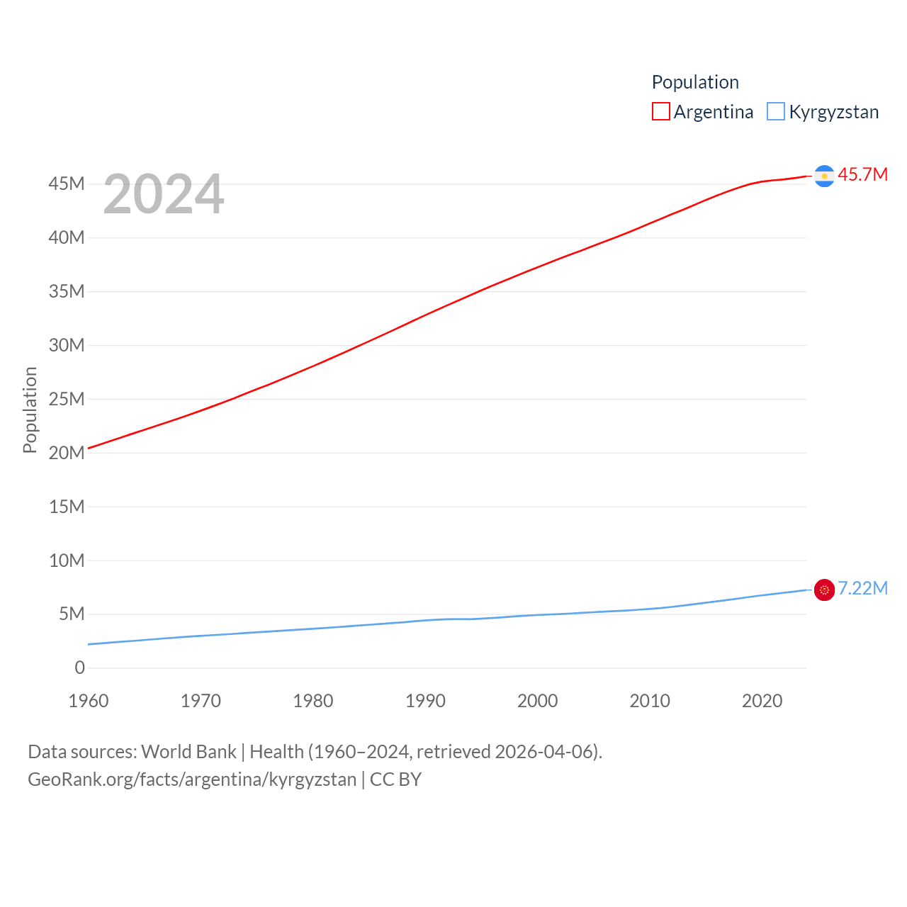 Argentina has a population of 45.7M (ranked 35/197), compared with 7.22M in Kyrgyzstan (ranked 106/197). Argentina's land area is 1,056,642 sq mi versus 74,054 sq mi for Kyrgyzstan (ranked 8th vs. 86th).