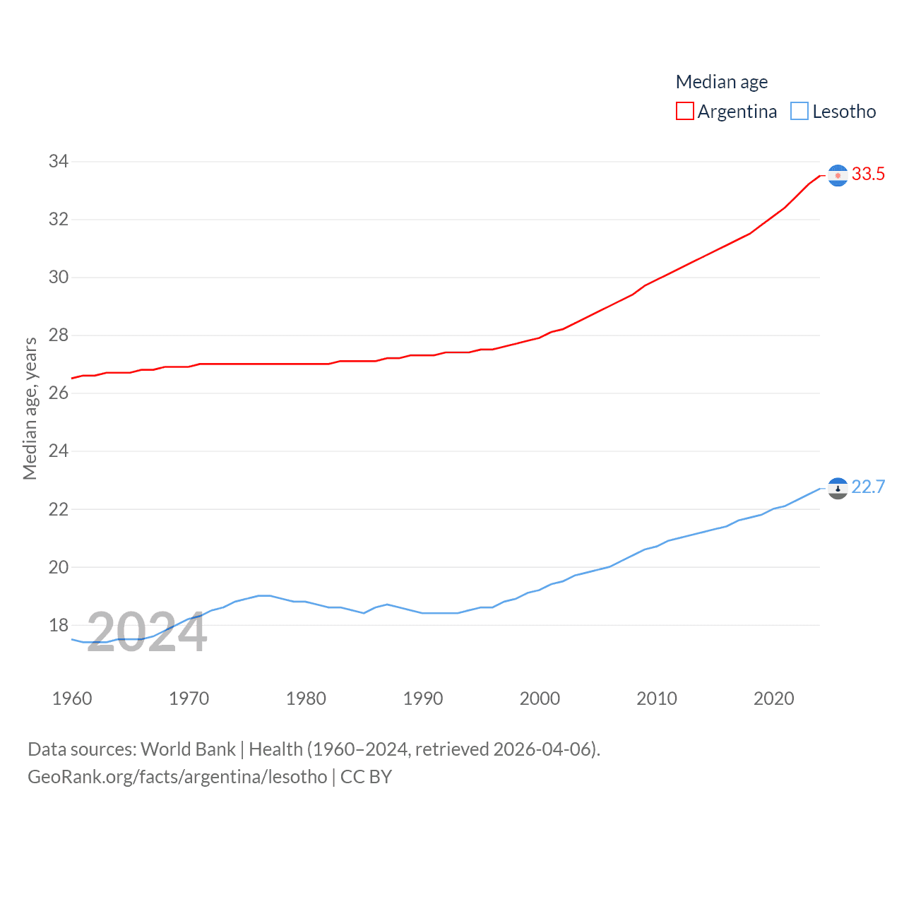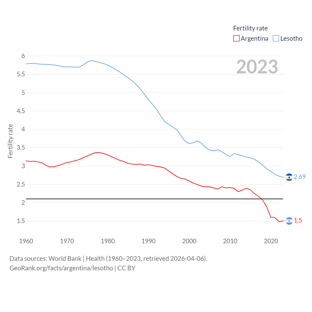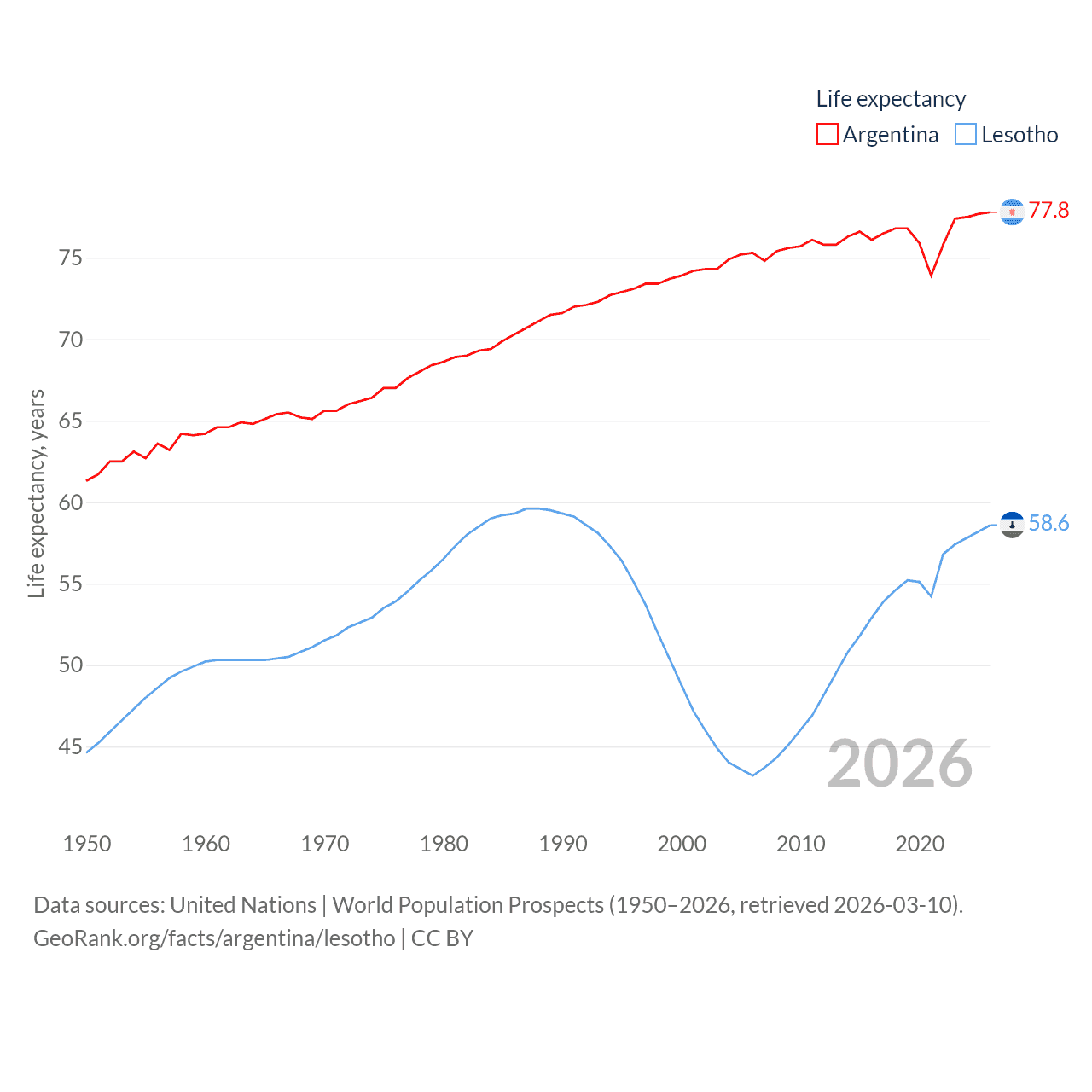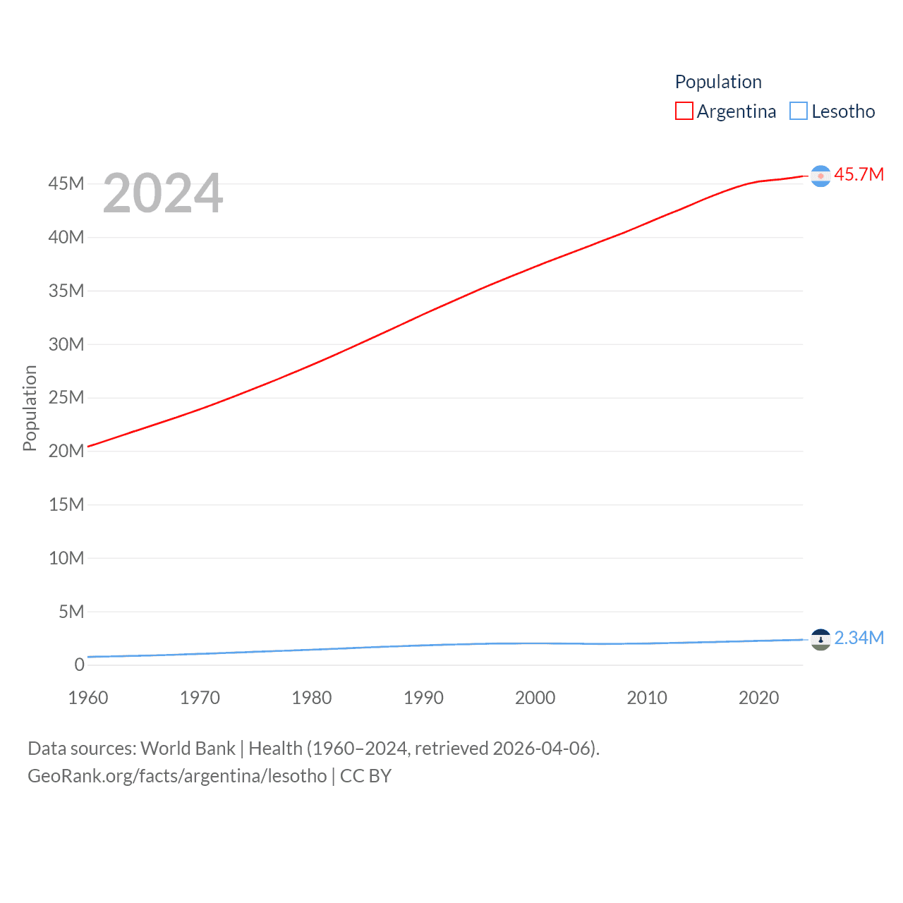 Argentina has a population of 45.7M (ranked 35/197), compared with 2.34M in Lesotho (ranked 145/197). Argentina's land area is 1,056,642 sq mi versus 11,722 sq mi for Lesotho (ranked 8th vs. 137th).