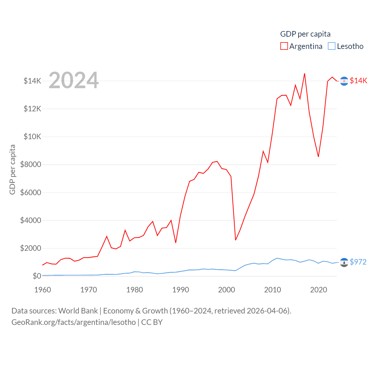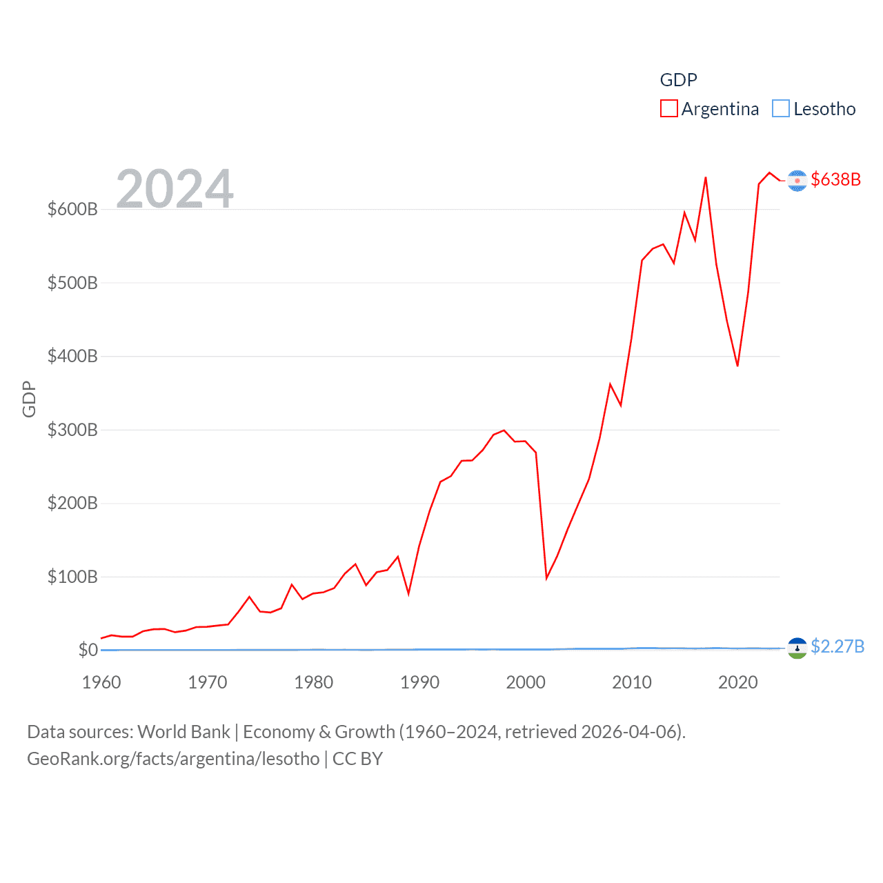 By GDP, Argentina ranks 24/197 ($638B) and Lesotho ranks 175/197 ($2.27B). By GDP per capita, Argentina ranks 72/197 ($13,970), while Lesotho ranks 181/197 ($972).