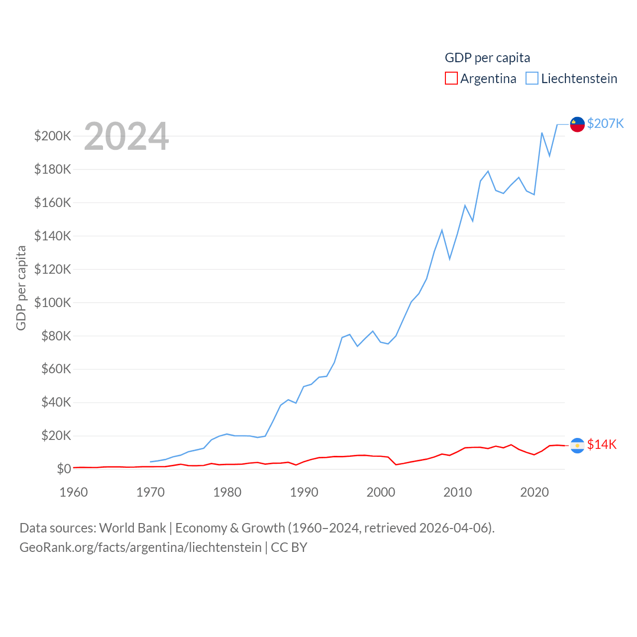 By GDP, Argentina ranks 24/197 ($638B) and Liechtenstein ranks 156/197 ($8.24B). By GDP per capita, Argentina ranks 72/197 ($13,970), while Liechtenstein ranks 2/197 ($206,781).