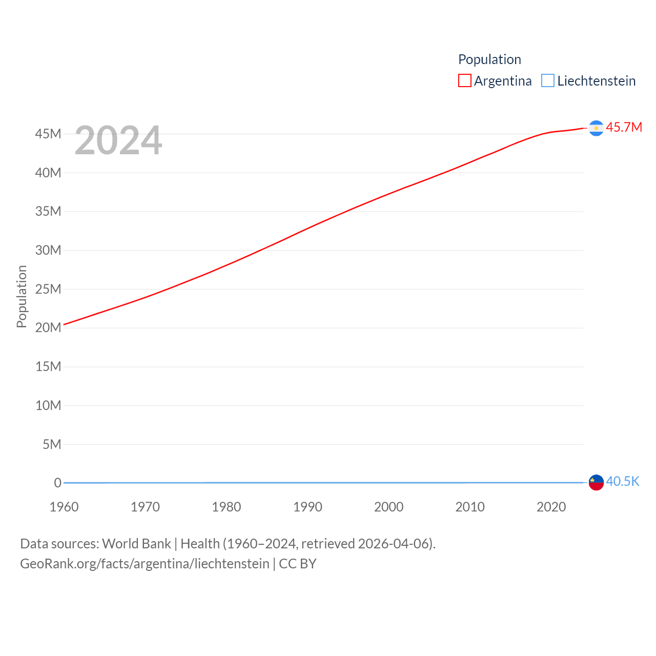 Argentina has a population of 45.7M (ranked 35/197), compared with 40.4K in Liechtenstein (ranked 190/197). Argentina's land area is 1,056,642 sq mi versus 61.8 sq mi for Liechtenstein (ranked 8th vs. 192nd).