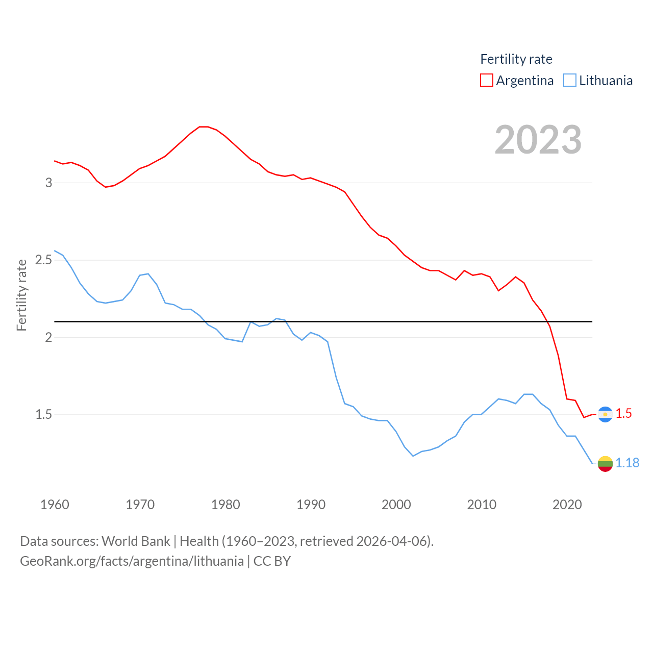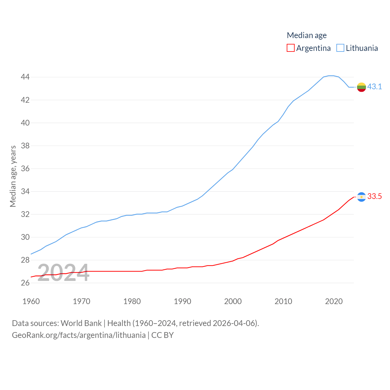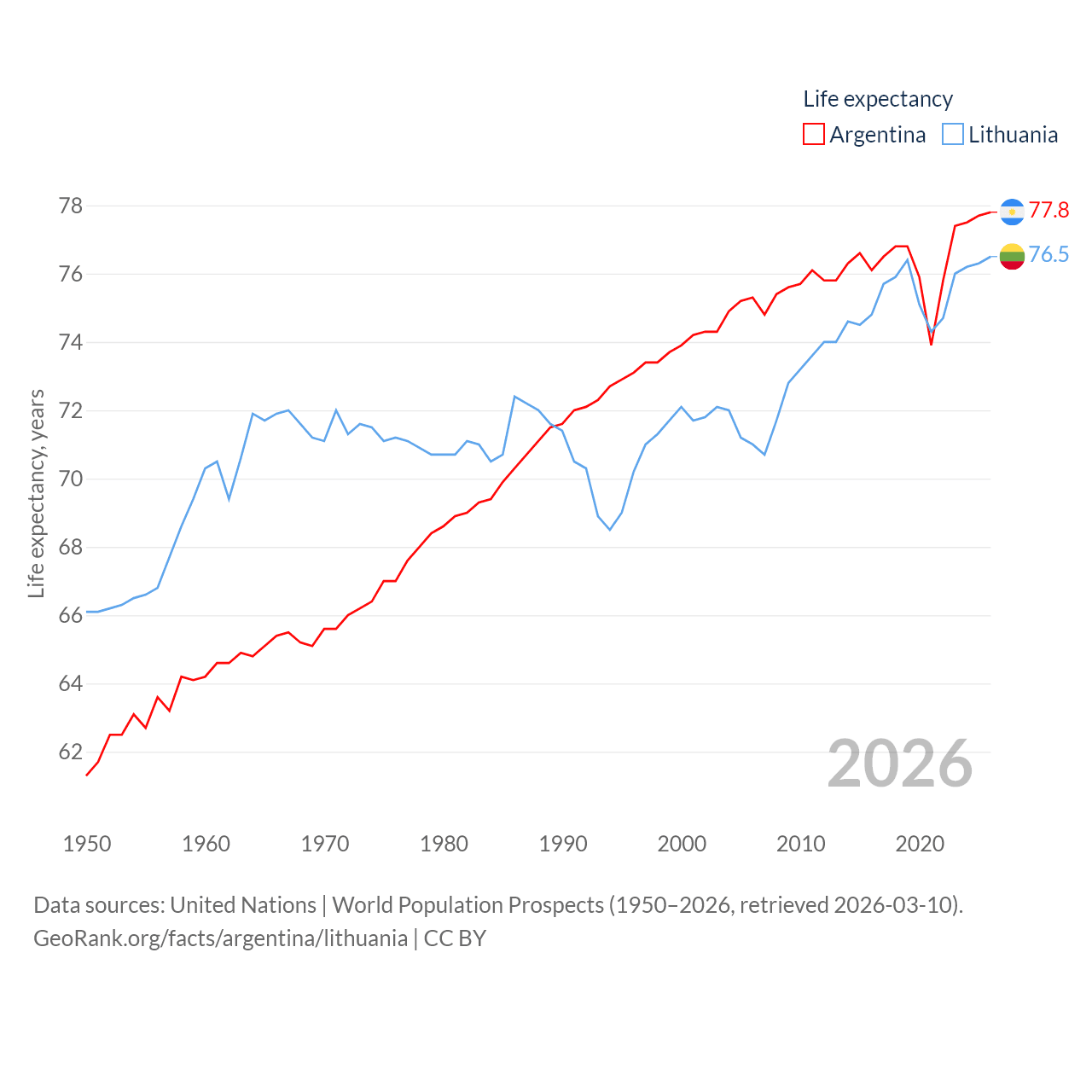 Argentina has a population of 45.7M (ranked 35/197), compared with 2.89M in Lithuania (ranked 137/197). Argentina's land area is 1,056,642 sq mi versus 24,170 sq mi for Lithuania (ranked 8th vs. 120th).