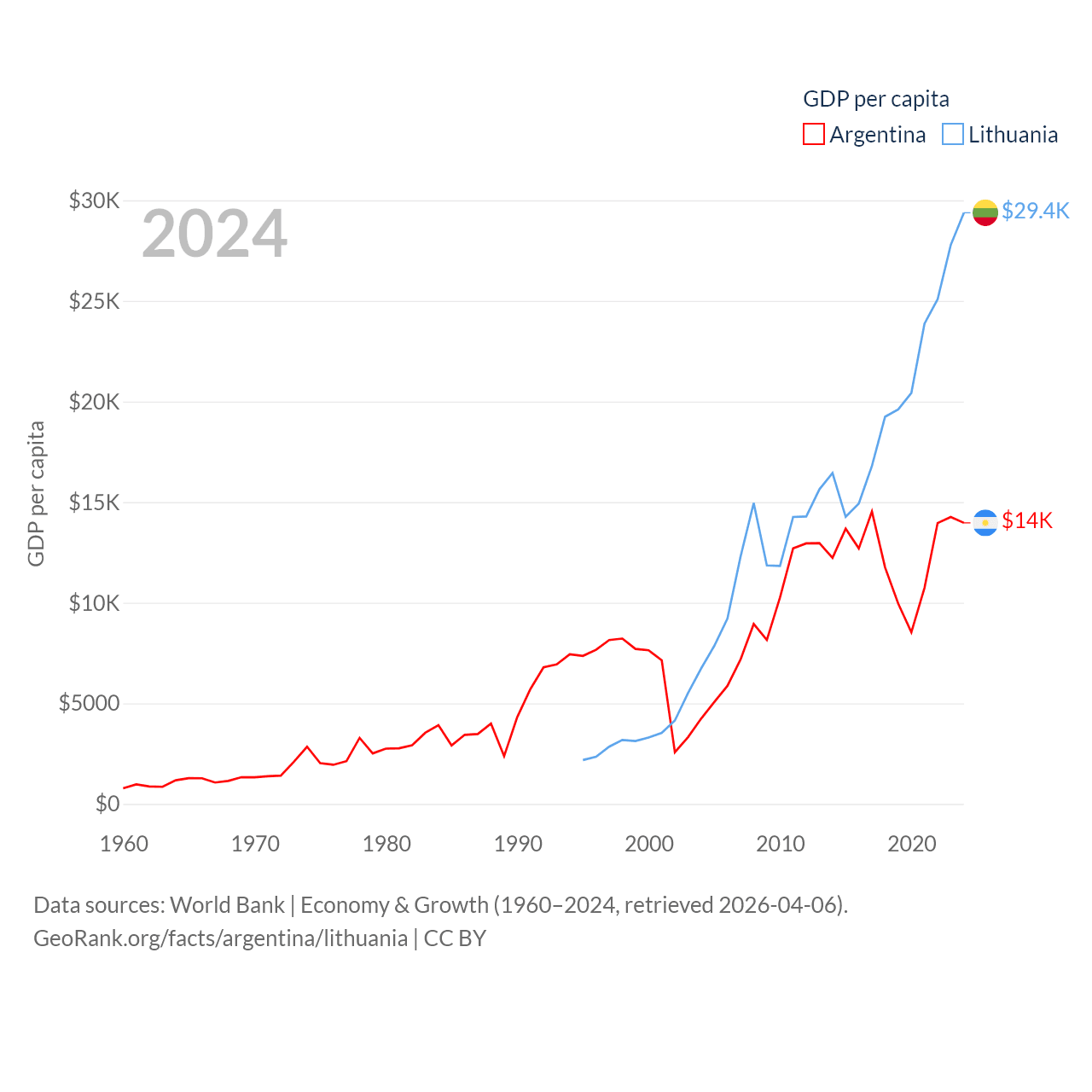 By GDP, Argentina ranks 24/197 ($638B) and Lithuania ranks 79/197 ($84.9B). By GDP per capita, Argentina ranks 72/197 ($13,970), while Lithuania ranks 43/197 ($29,384).