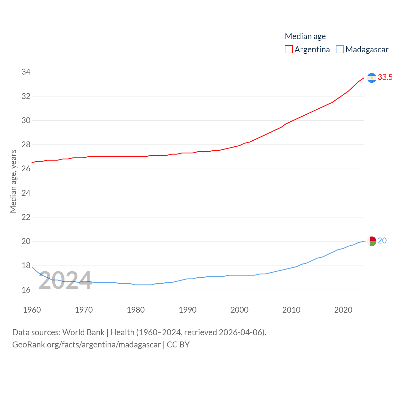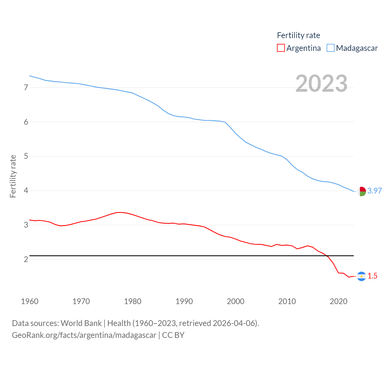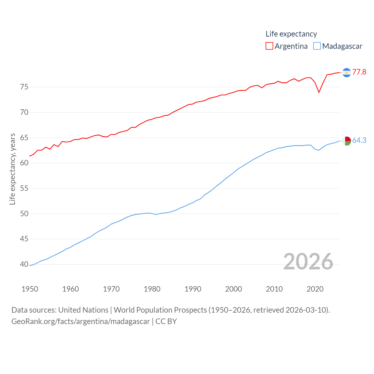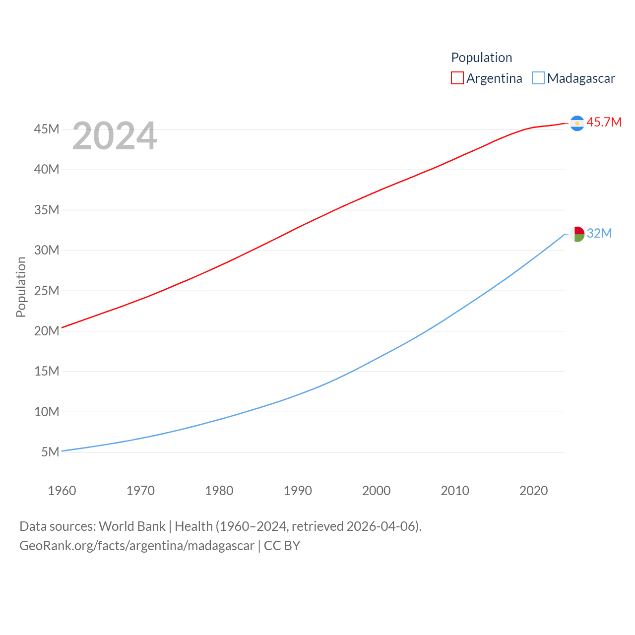 Argentina has a population of 45.7M (ranked 35/197), compared with 32M in Madagascar (ranked 49/197). Argentina's land area is 1,056,642 sq mi versus 224,634 sq mi for Madagascar (ranked 8th vs. 44th).
