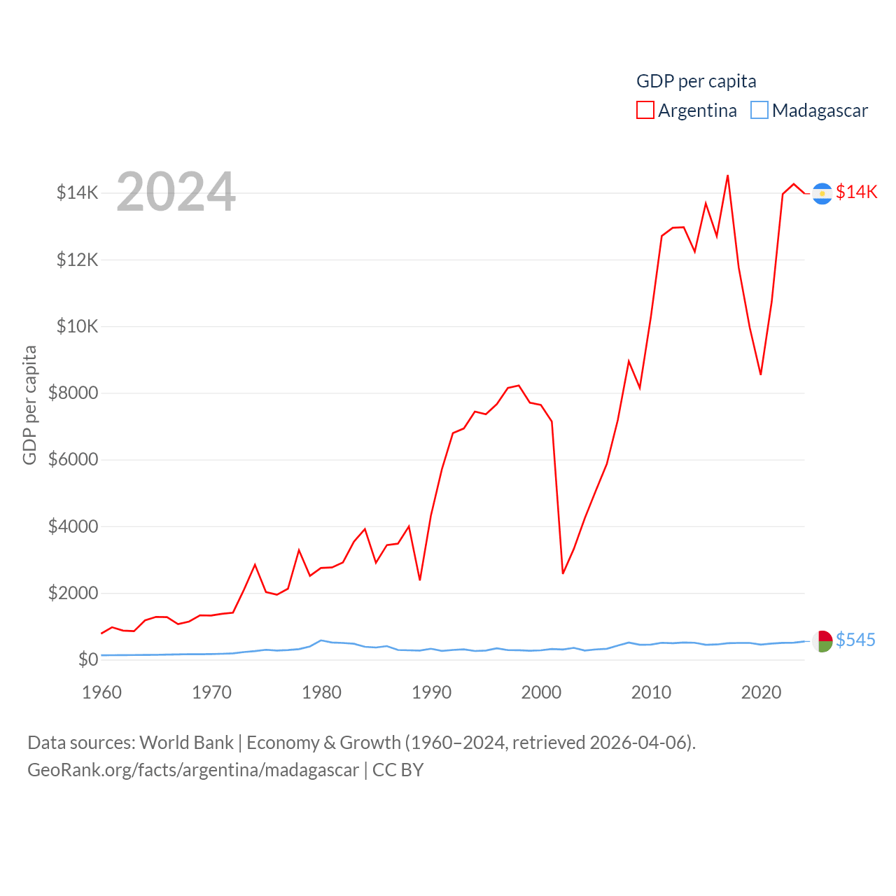 By GDP, Argentina ranks 24/197 ($638B) and Madagascar ranks 136/197 ($17.4B). By GDP per capita, Argentina ranks 72/197 ($13,970), while Madagascar ranks 193/197 ($545).