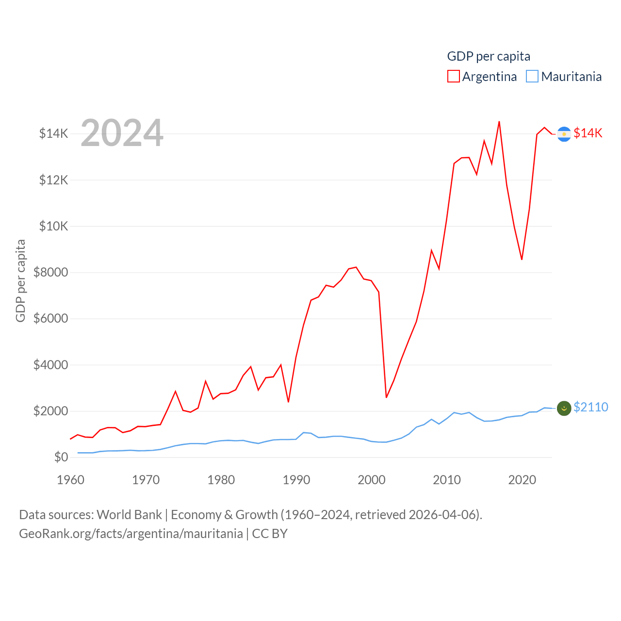 By GDP, Argentina ranks 24/197 ($638B) and Mauritania ranks 153/197 ($10.9B). By GDP per capita, Argentina ranks 72/197 ($13,970), while Mauritania ranks 156/197 ($2,110).