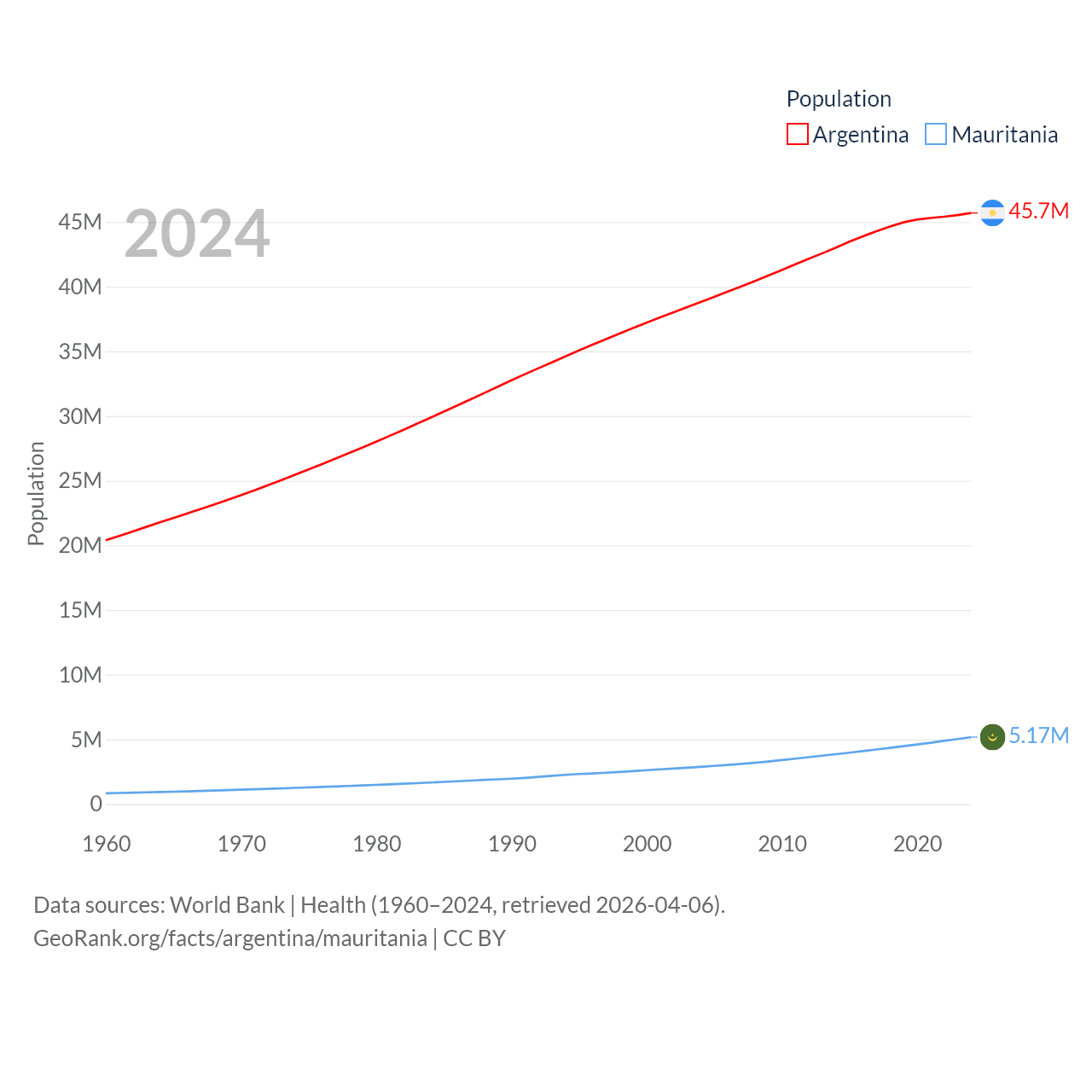 Argentina has a population of 45.7M (ranked 35/197), compared with 5.17M in Mauritania (ranked 125/197). Argentina's land area is 1,056,642 sq mi versus 397,955 sq mi for Mauritania (ranked 8th vs. 28th).