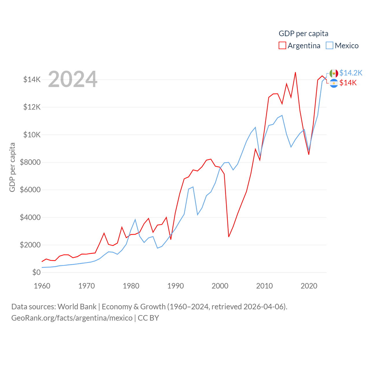By GDP, Argentina ranks 24/197 ($638B) and Mexico ranks 13/197 ($1.86T). By GDP per capita, Argentina ranks 72/197 ($13,970), while Mexico ranks 69/197 ($14,186).